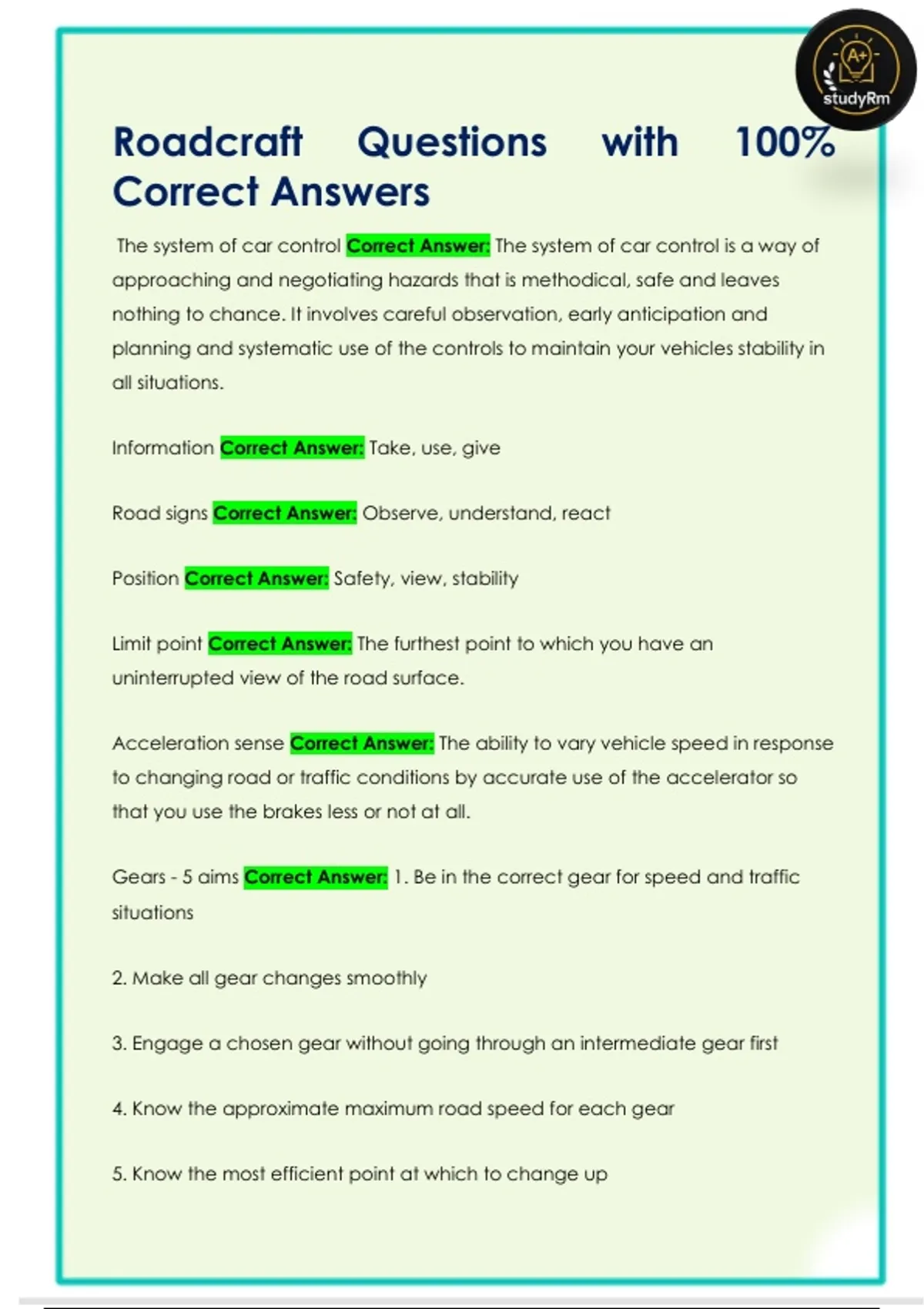 Gears - 5 aims Correct Answer: 1. Be in the correct gear for speed and traffic
