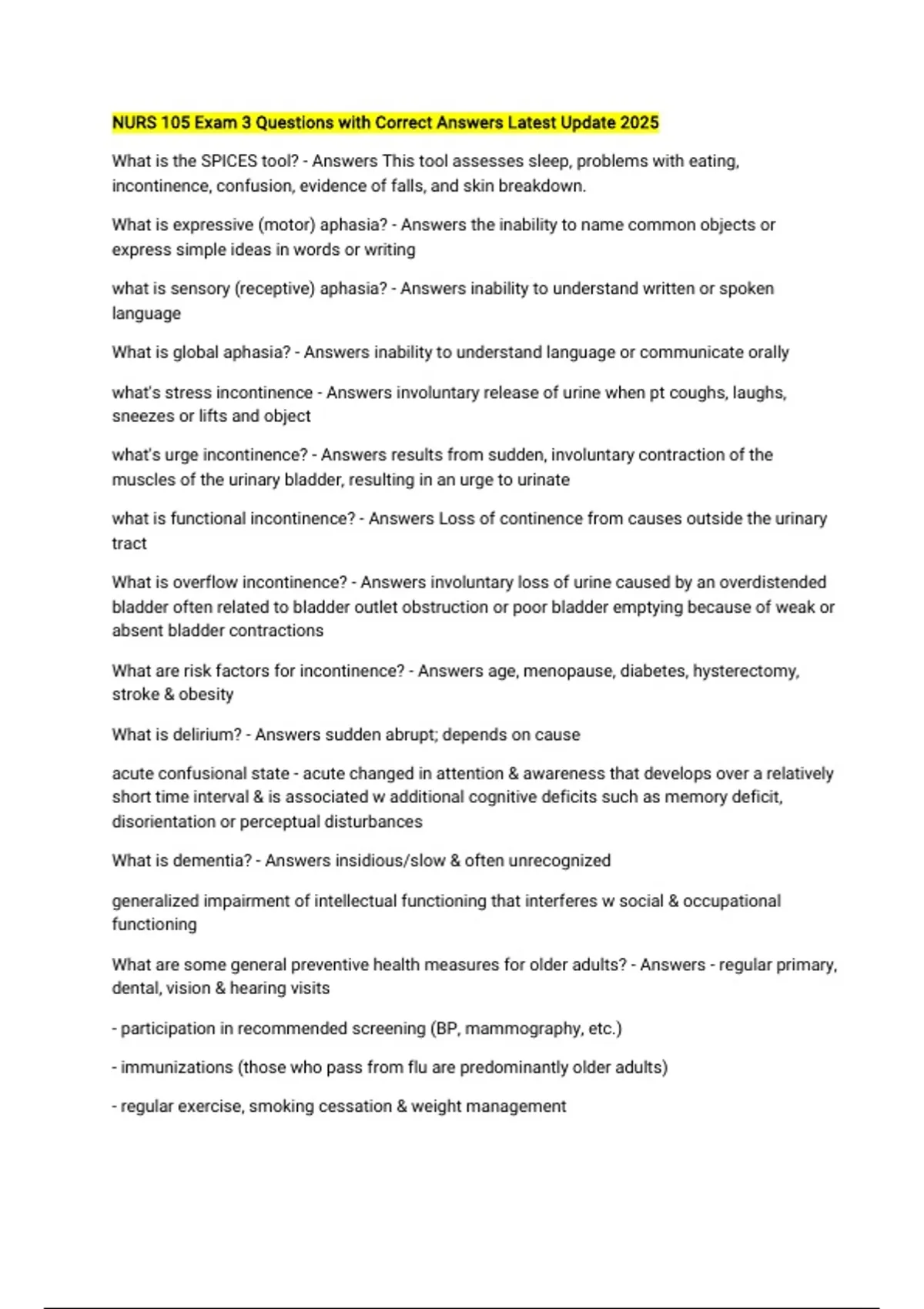 NURS 105 Exam 3 Questions with Correct Answers Latest Update 2025 What is the SPICES tool? - Answers This tool assesses sleep, problems with eating, incontinence, confusion, evidence of falls, and skin breakdown. What is expressive (motor) aphasia? - Answers the inability to name common objects or express simple ideas in words or writing what is sensory (receptive) aphasia? - Answers inability to understand written or spoken language What is global aphasia? - Answers inability to understand language or communicate orally what's stress incontinence - Answers involuntary release of urine when pt coughs, laughs, sneezes or lifts and object what's urge incontinence? - Answers results from sudden, involuntary contraction of the muscles of the urinary bladder, resulting in an urge to urinate what is functional incontinence? - Answers Loss of continence from causes outside the urinary tract What is overflow incontinence? - Answers involuntary loss of urine caused by an overdistended bladder often related to bladder outlet obstruction or poor bladder emptying because of weak or absent bladder contractions What are risk factors for incontinence? - Answers age, menopause, diabetes, hysterectomy, stroke & obesity What is delirium? - Answers sudden abrupt; depends on cause acute confusional state - acute changed in attention & awareness that develops over a relatively short time interval & is associated w additional cognitive deficits such as memory deficit, disorientation or perceptual disturbances What is dementia? - Answers insidious/slow & often unrecognized generalized impairment of intellectual functioning that interferes w social & occupational functioning What are some general preventive health measures for older adults? - Answers - regular primary, dental, vision & hearing visits - participation in recommended screening (BP, mammography, etc.) - immunizations (those who pass from flu are predominantly older adults) - regular exercise, smoking cessation & weight management - attaining & maintaining target weight - eating low fat, we'll balanced diet or specific diet What is depression? - Answers happens w major life changes; often abrupt but can be gradual What is hyperactive delirium? - Answers characterized by agitations, restlessness, emotional liability & psychotic features such as hallucinations & illusions that often interfere w delivery of care medical emergency & requires prompt assessment & intervention What are the 3 components of sensory experience? - Answers Reception Perception Reaction what is reception? - Answers stimulation of a receptor such as light, touch, or sound what is perception? - Answers integration and interpretation of stimuli based on a person's experiences low consciousness = impair sensory perception