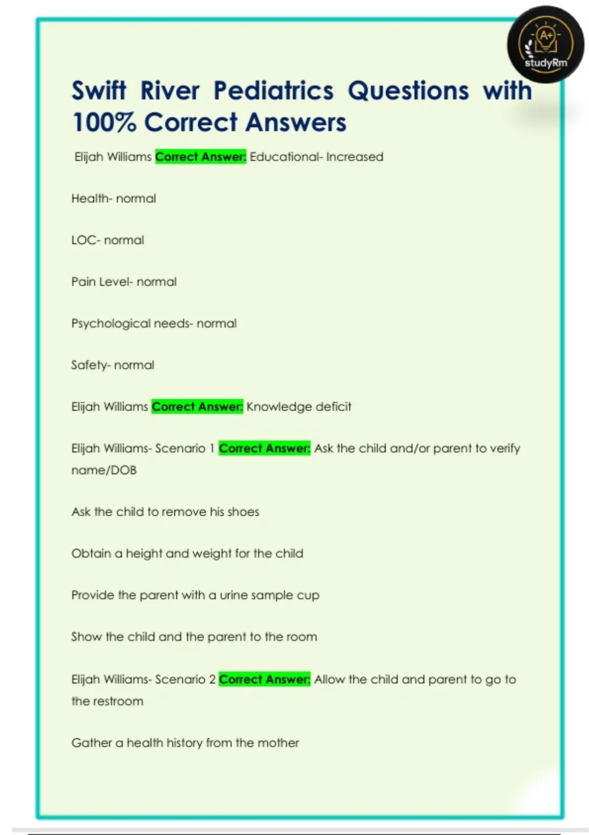 Swift River Pediatrics Questions with 100% Correct Answers Swift River Pediatrics Questions with 100% Correct Answers