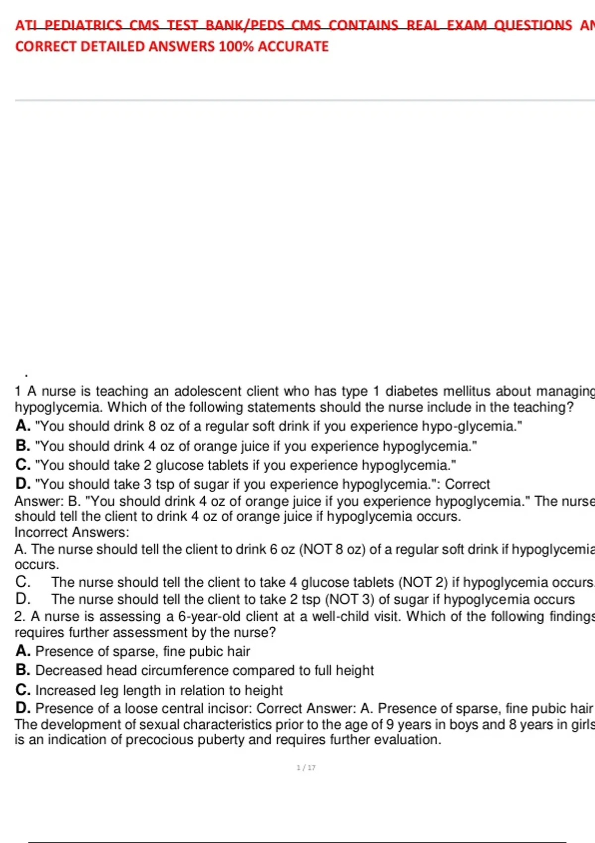 ,ATI PEDIATRICS CMS TEST BANK/PEDS CMS CONTAINS REAL EXAM QUESTIONS AN