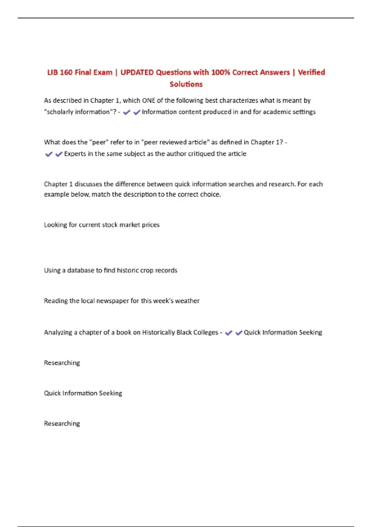 LIB 160 Final Exam | UPDATED Questions with 100% Correct Answers | Verified Solutions