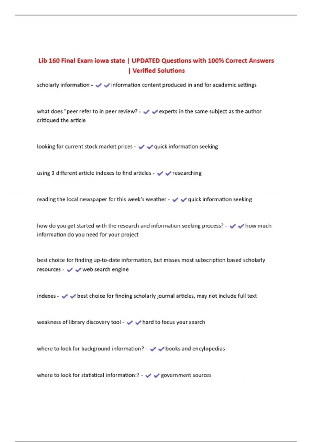 Lib 160 Final Exam iowa state | UPDATED Questions with 100% Correct Answers | Verified Solutions
