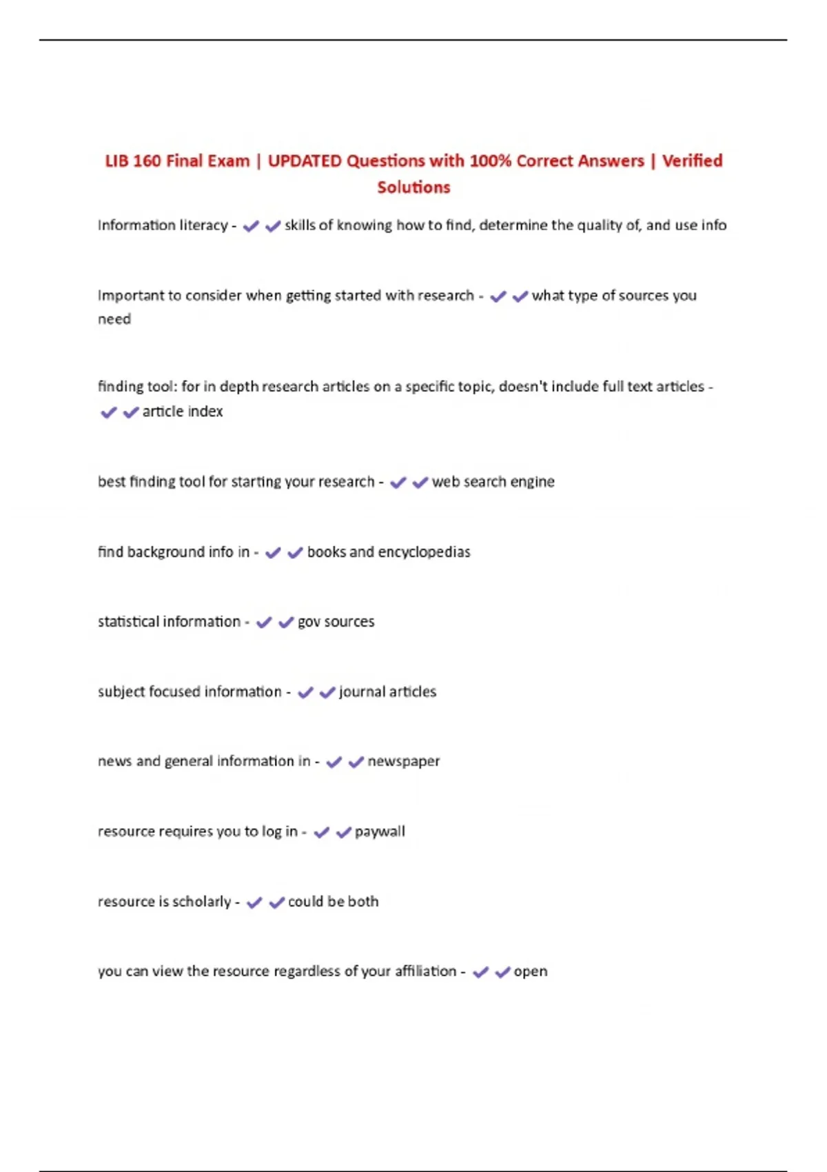 LIB 160 Final Exam | UPDATED Questions with 100% Correct Answers | Verified Solutions