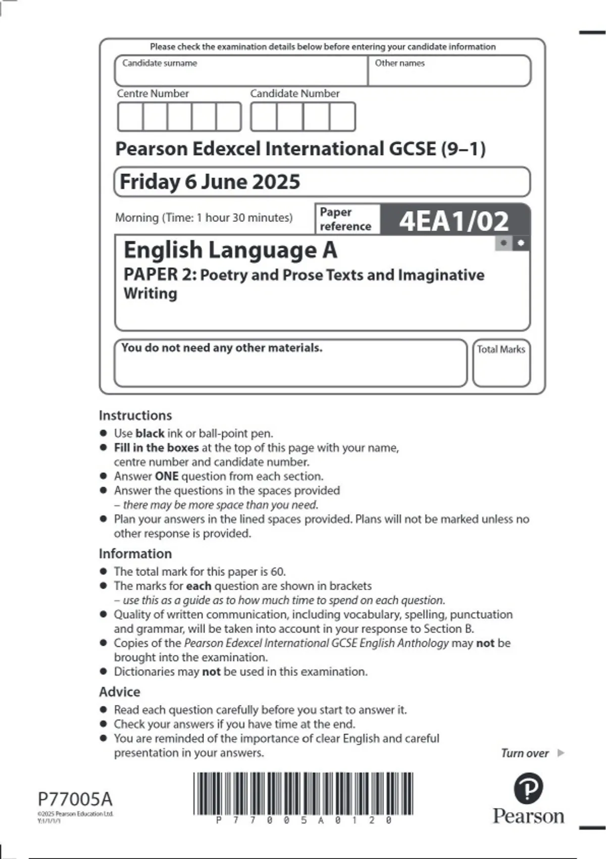 2025 Pearson Edexcel IGCSE English Language A (9–1) PAPER 2 (4EA1/02) QUESTION PAPER: Poetry and Prose Texts and Imaginative Writing