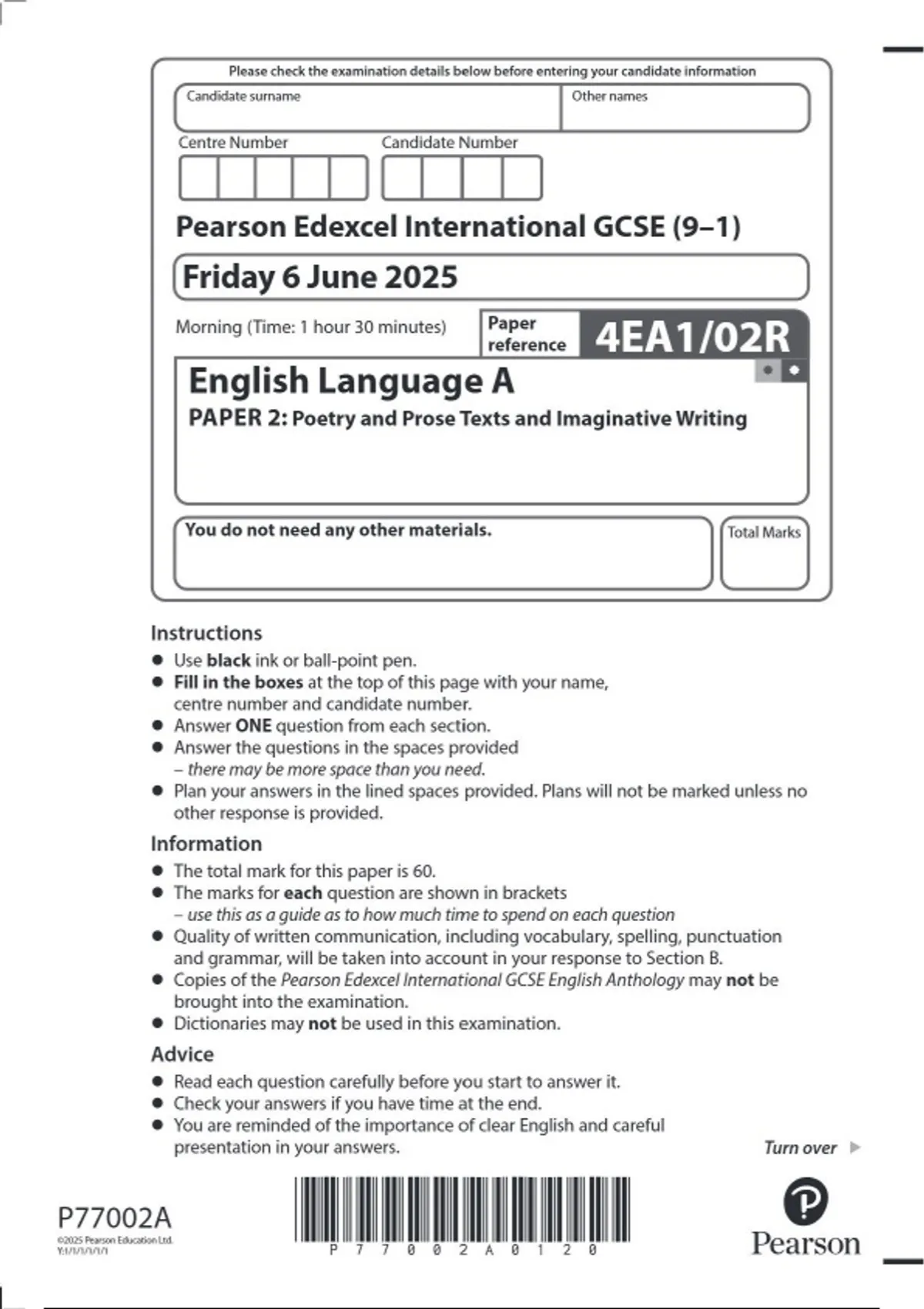 2025 Pearson Edexcel IGCSE English Language A (9–1) PAPER 2R (4EA1/02R) QUESTION PAPER: Poetry and Prose Texts and Imaginative Writing