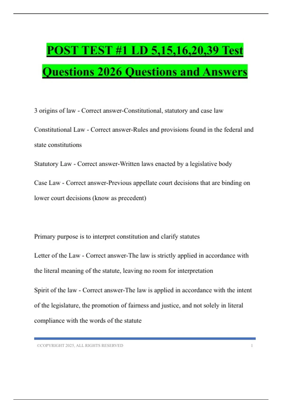 Statutory Law - Correct answer-Written laws enacted by a legislative body