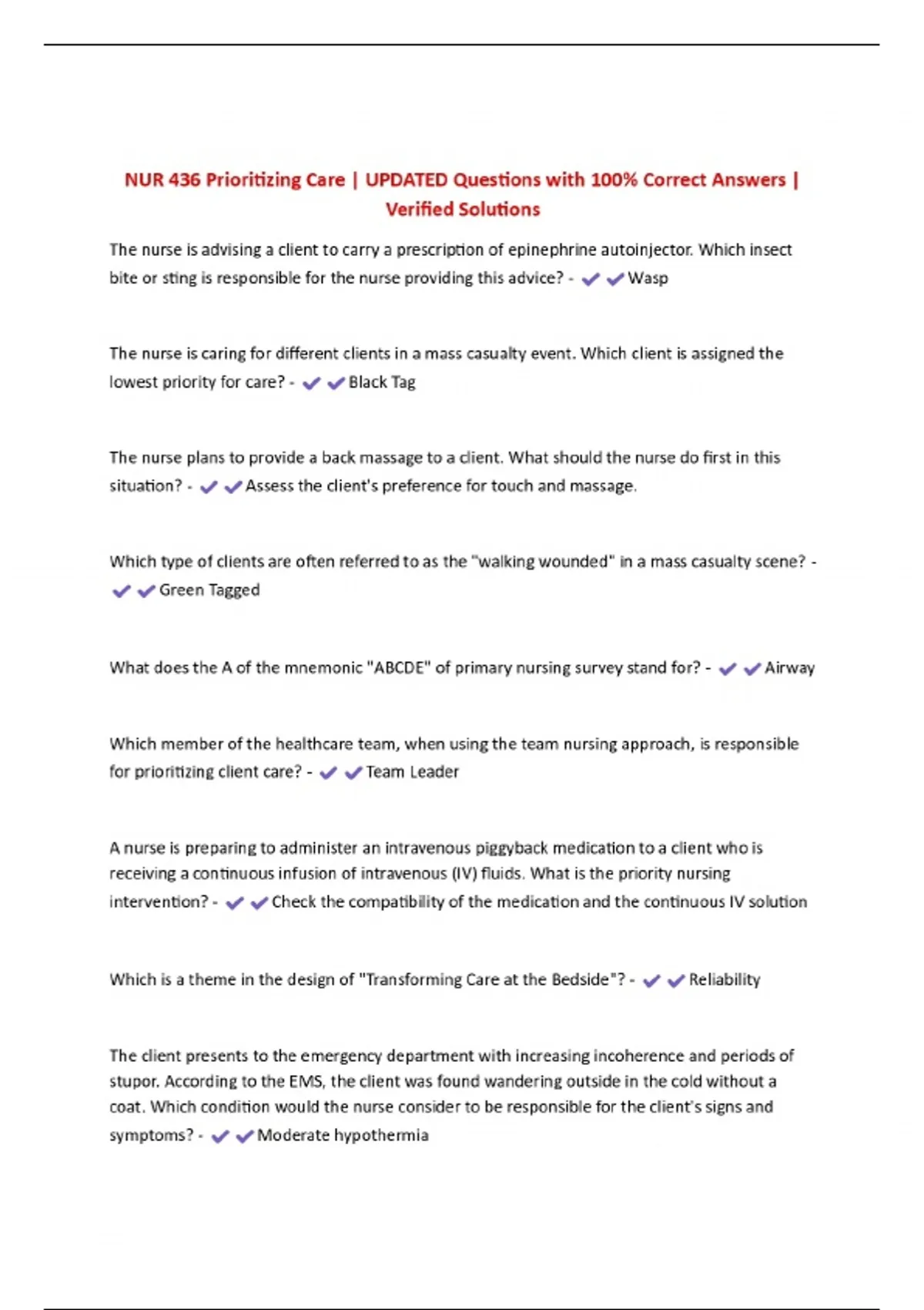 NUR 436 Prioritizing Care | UPDATED Questions with 100% Correct Answers | Verified Solutions