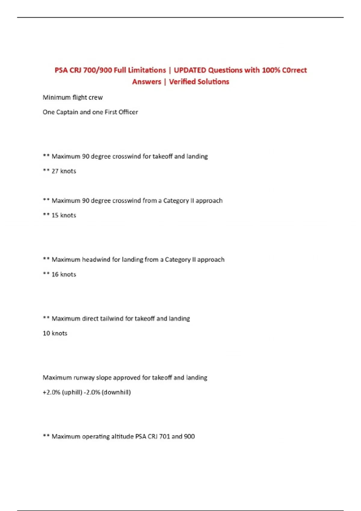 PSA CRJ 700/900 Full Limitations | UPDATED Questions with 100% C0rrect Answers | Verified Solutions