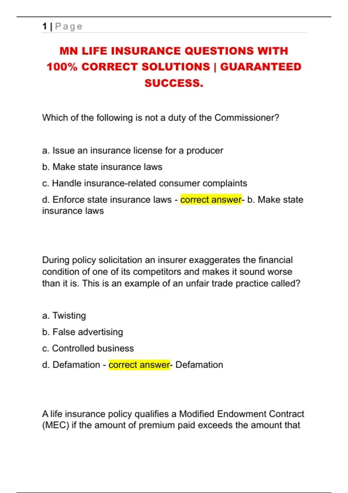 MN LIFE INSURANCE QUESTIONS WITH 100% CORRECT SOLUTIONS | GUARANTEED SUCCESS.
