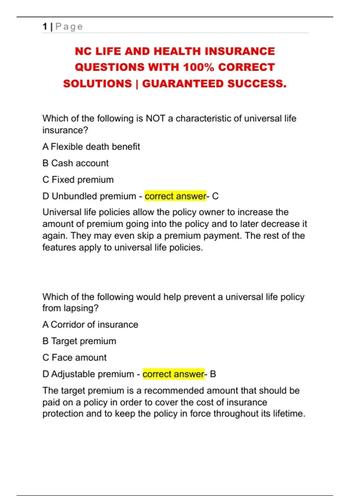 D Adjustable premium - correct answer- B