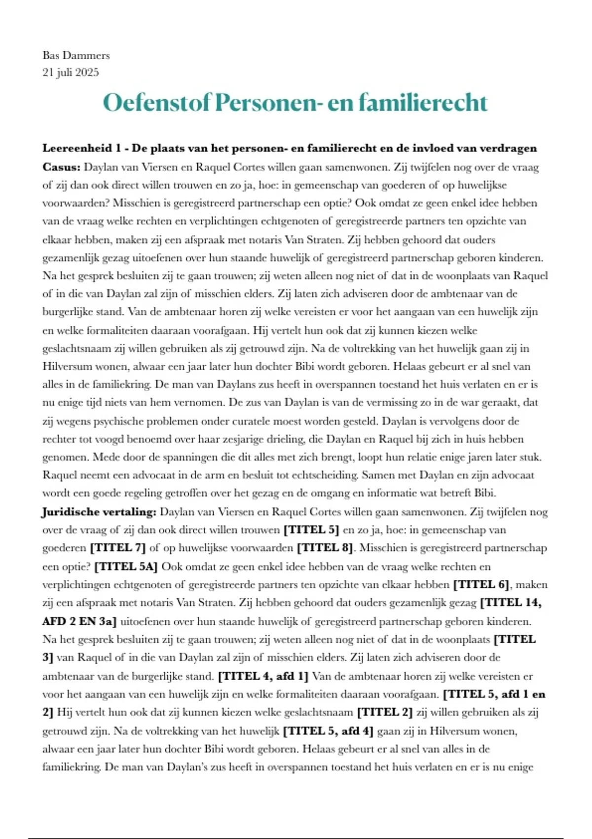 Het betreft een uitgebreide uitwerking van oefenopgaven in voorbereiding op het tentamen Personen- en familierecht (RB3702), gedoceerd aan de Open Universiteit.