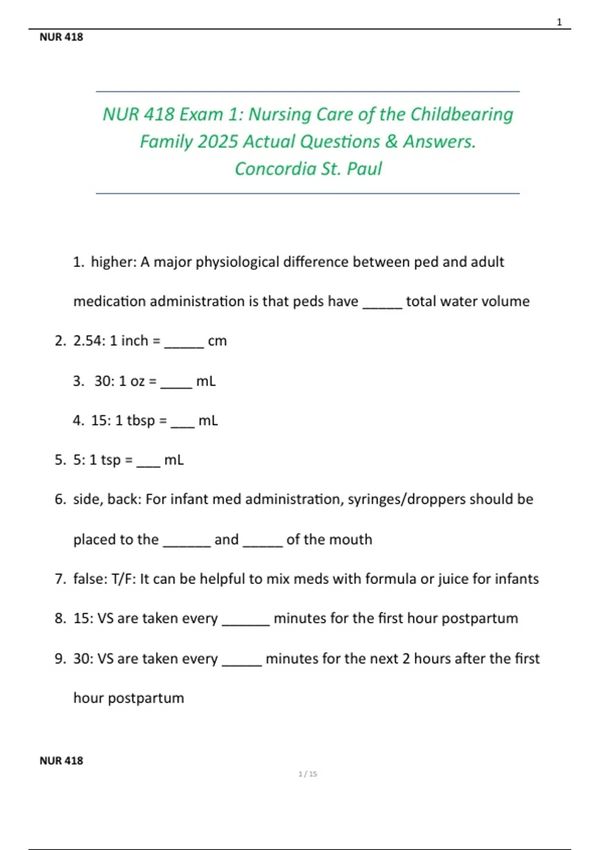 NUR 418 Exam 1: Nursing Care of the Childbearing