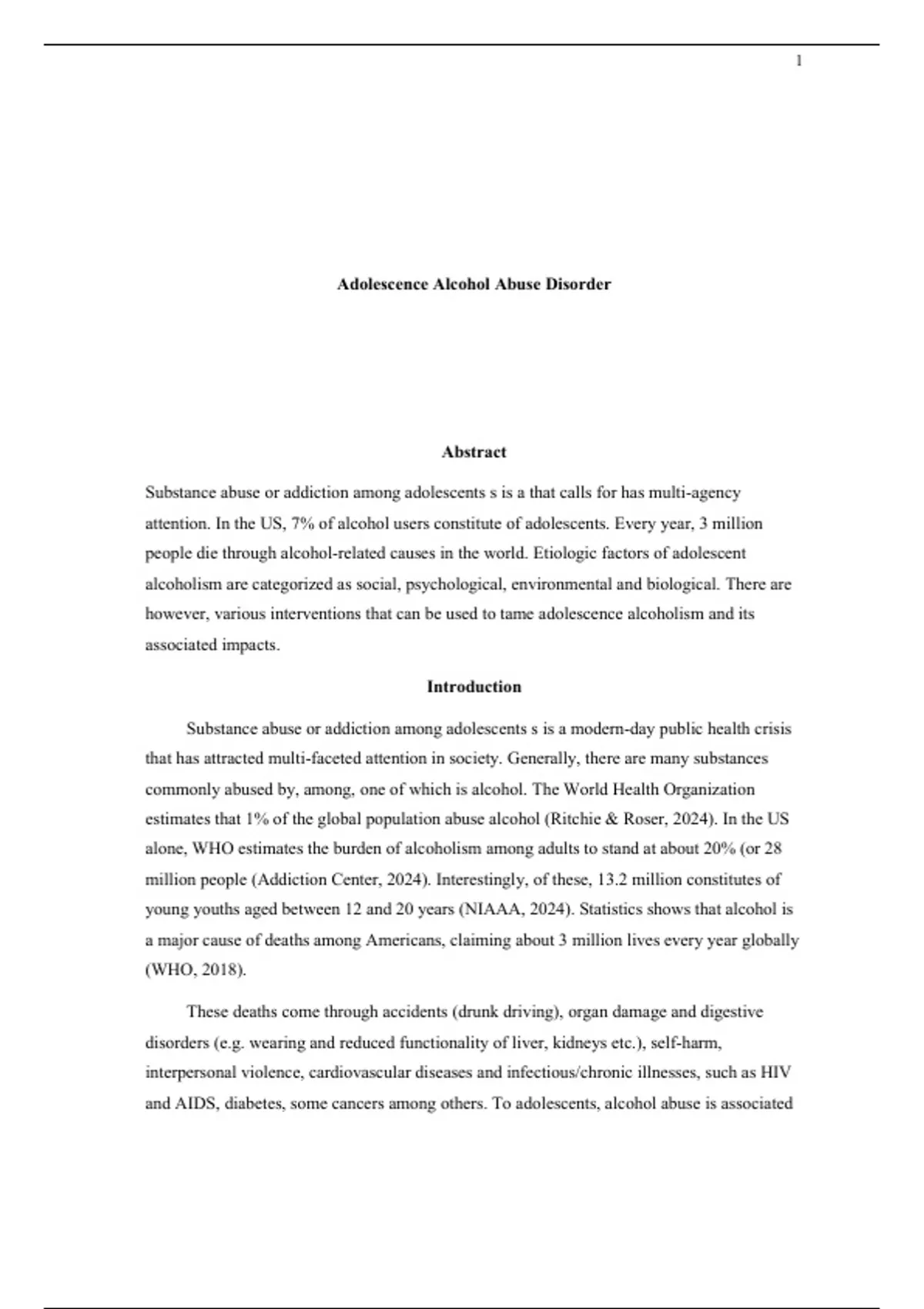 The document provides an overview of Alcohol Abuse Disorder (Alcoholism) in the adolescent population, addressing its public health significance, etiology (causes), and potential interventions. he paper characterizes adolescent substance abuse as a modern-day public health crisis. Prevalence and Impact: Statistics: In the U.S., adolescents constitute 7% of alcohol users, and globally, alcohol-related causes claim about 3 million lives annually. Consequences: Alcoholism contributes to deaths through accidents (drunk driving), organ damage, self-harm, interpersonal violence, and cardiovascular diseases. Etiology (Causative Factors): The causes of adolescent alcoholism are multifactorial, categorized into four main areas: Social Factors: Includes the influence of peer pressure, social acceptance, and ease of access to alcohol. Psychological Factors: Involves stress, depression, anxiety, and poor coping mechanisms, leading to self-medication through alcohol. Environmental Factors: Relates to the home environment (e.g., parental drinking habits), cultural norms, and marketing/availability of alcohol. Biological Factors: Includes genetic predisposition and inherent physiological responses to alcohol consumption. Interventions: The document concludes by noting that various interventions are available to address the disorder and its associated impacts, although it does not detail the specific interventions. The focus is on the need for multi-agency attention to manage the crisis effectively.