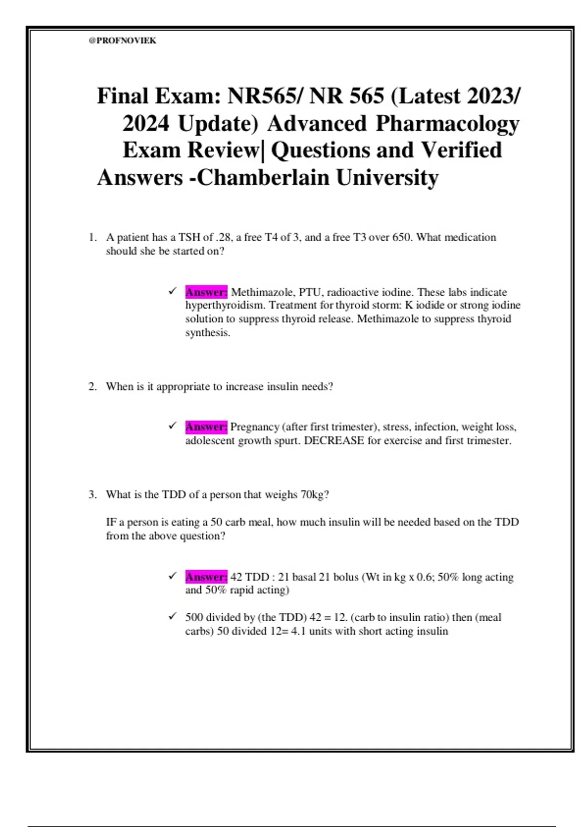 This document is a final exam review guide for the NR565 / NR 565 Advanced Pharmacology course at Chamberlain University. It includes questions and verified answers covering: Thyroid disorders (hyperthyroidism, thyroid storm treatment) Insulin therapy (dose adjustments, pregnancy, stress, growth spurts) Calculating the Total Daily Dose (TDD) of insulin Carb-to-insulin ratio and mealtime insulin needs The document is designed to help students prepare for the endocrine and diabetes portion of the NR565 final exam by summarizing major concepts and providing step-by-step calculations.