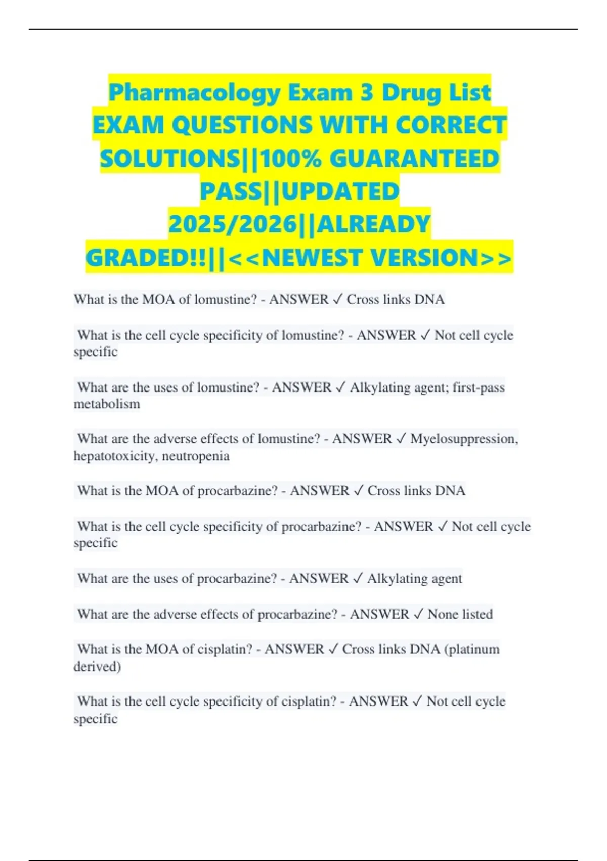 Pharmacology Exam 3 Drug List EXAM QUESTIONS WITH CORRECT SOLUTIONS||100% GUARANTEED PASS||UPDATED 2025/2026||ALREADY GRADED!!||&lt;&lt;NEWEST VERSION&gt;&gt; What is the MOA of lomustine? - ANSWER Cross links DNA What is the cell cycle specificity of lomustine? - ANSWER Not cell cycle specific What are the uses of lomustine? - ANSWER Alkylating agent; first-pass metabolism What are the adverse effects of lomustine? - ANSWER Myelosuppression, hepatotoxicity, neutropenia What is the MOA of procarbazine? - ANSWER Cross links DNA What is the cell cycle specificity of procarbazine? - ANSWER Not cell cycle specific What are the uses of procarbazine? - ANSWER Alkylating agent What are the adverse effects of procarbazine? - ANSWER None listed What is the MOA of cisplatin? - ANSWER Cross links DNA (platinum derived) What is the cell cycle specificity of cisplatin? - ANSWER Not cell cycle specific What are the uses of cisplatin? - ANSWER Alkylating agent What are the adverse effects of cisplatin? - ANSWER Fatal pulmonary edema in cats, nephrotoxicity, nausea What is the MOA of carboplatin? - ANSWER Cross links DNA (platinum derived) What is the cell cycle specificity of carboplatin? - ANSWER Not cell cycle specific What are the uses of carboplatin? - ANSWER Alkylating agent; safer platinum compound for cats What are the adverse effects of carboplatin? - ANSWER Myelosuppression, monitor platelets, GI effects What is the MOA of methotrexate? - ANSWER Inhibits pyrimidine and purine synthesis, disrupts DNA What is the cell cycle specificity of methotrexate? - ANSWER S phase arrest What are the uses of methotrexate? - ANSWER Antimetabolite What are the adverse effects of methotrexate? - ANSWER Myelosuppression, GI effects What is the MOA of 5-fluorouracil? - ANSWER Pyrimidine analog, disrupts DNA What is the cell cycle specificity of 5-fluorouracil? - ANSWER S phase arrest What are the uses of 5-fluorouracil? - ANSWER Antimetabolite