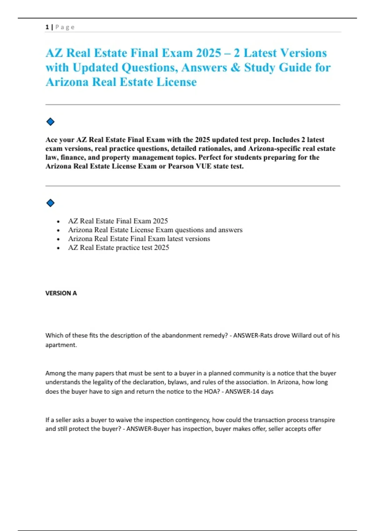 AZ Real Estate Final Exam 2025 – 2 Latest Versions