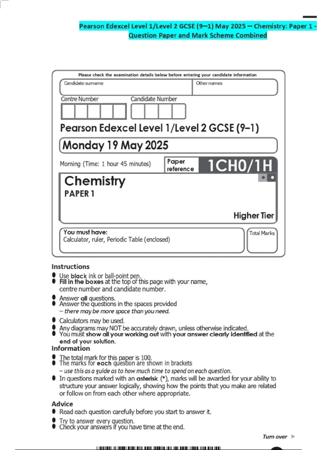Pearson Edexcel Level 1/Level 2 GCSE (9-1) May 2025 - Chemistry: Paper 1-Question Paper and Mark Scheme Combined