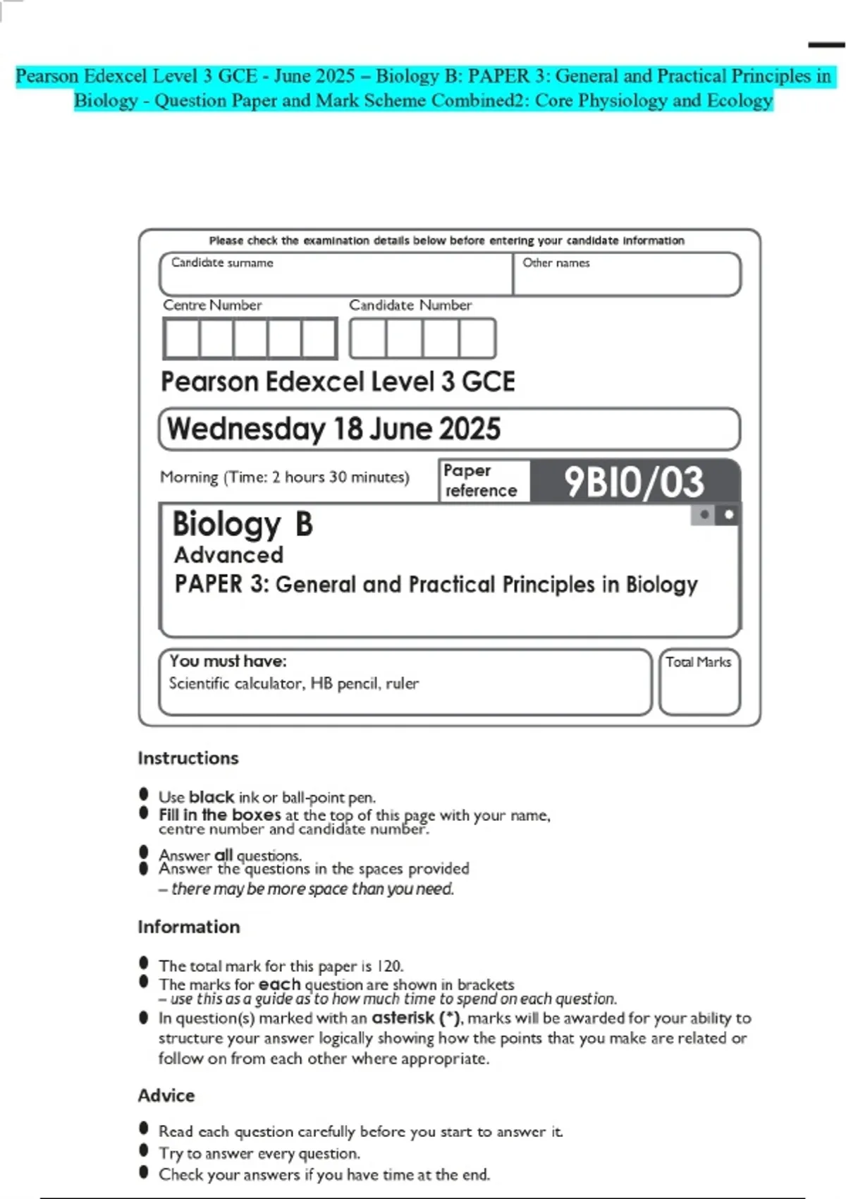 Pearson Edexcel Level 3 GCE - June 2025 - Biology B: PAPER 3: General and Practical Principles in Biology - Question Paper and Mark Scheme Combined