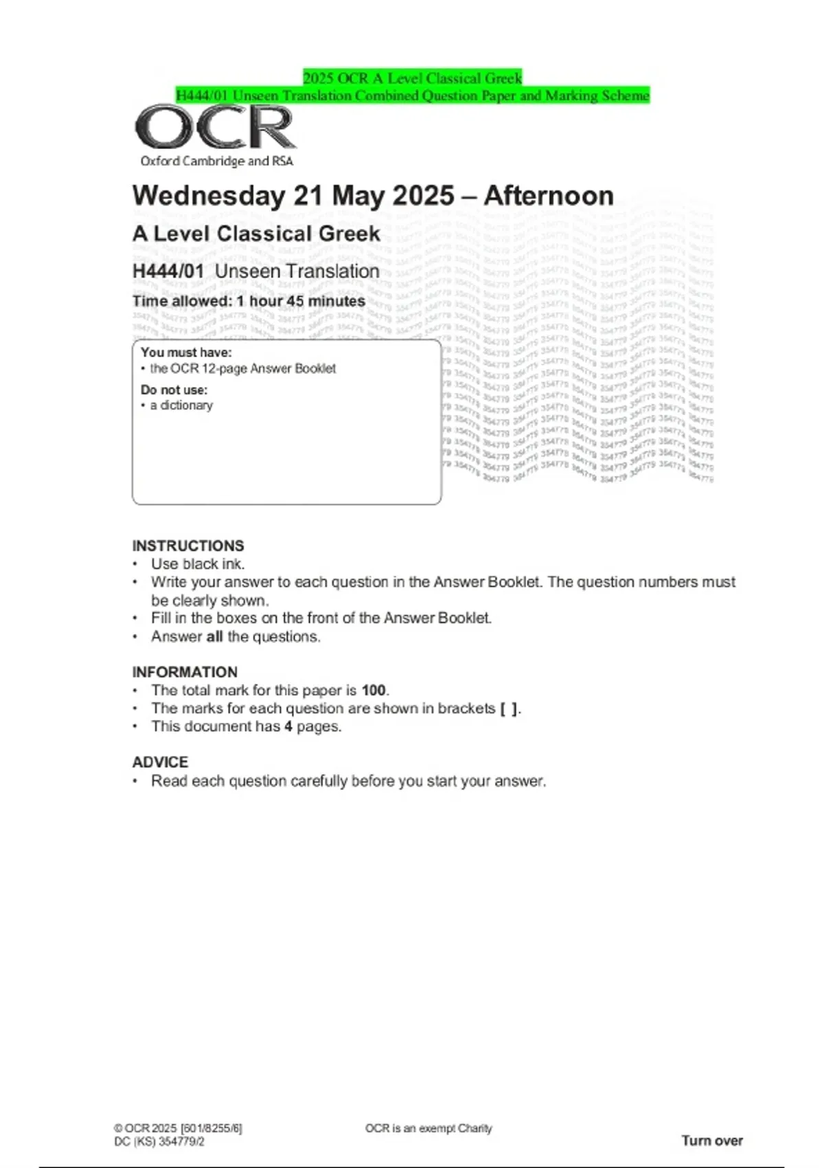 2025 OCR A Level Classical Greek H444/01 Unseen Translation Combined Question Paper and Marking Scheme