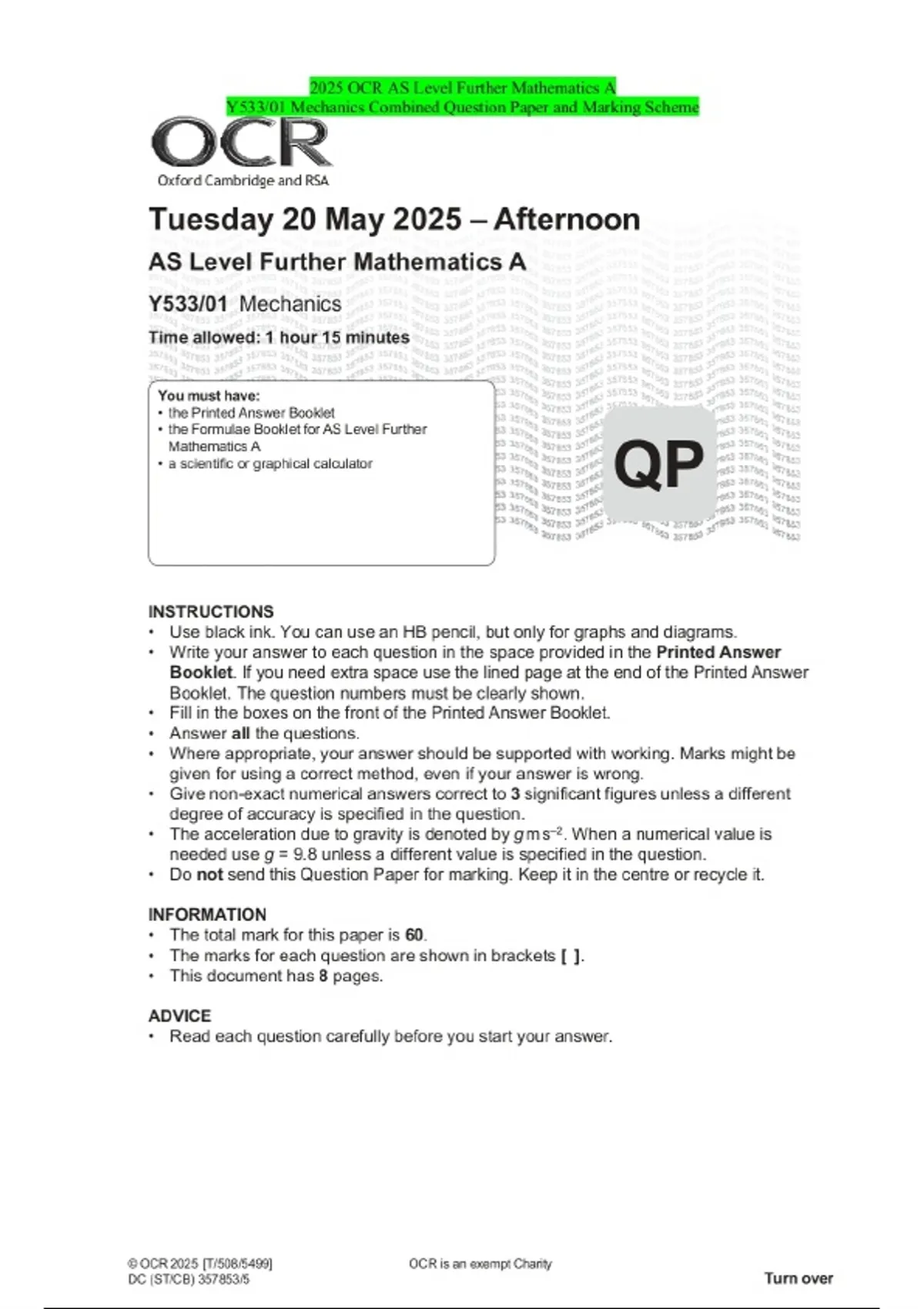 2025 OCR AS Level Further Mathematics A Y533/01 Mechanics Combined Question Paper and Marking Scheme