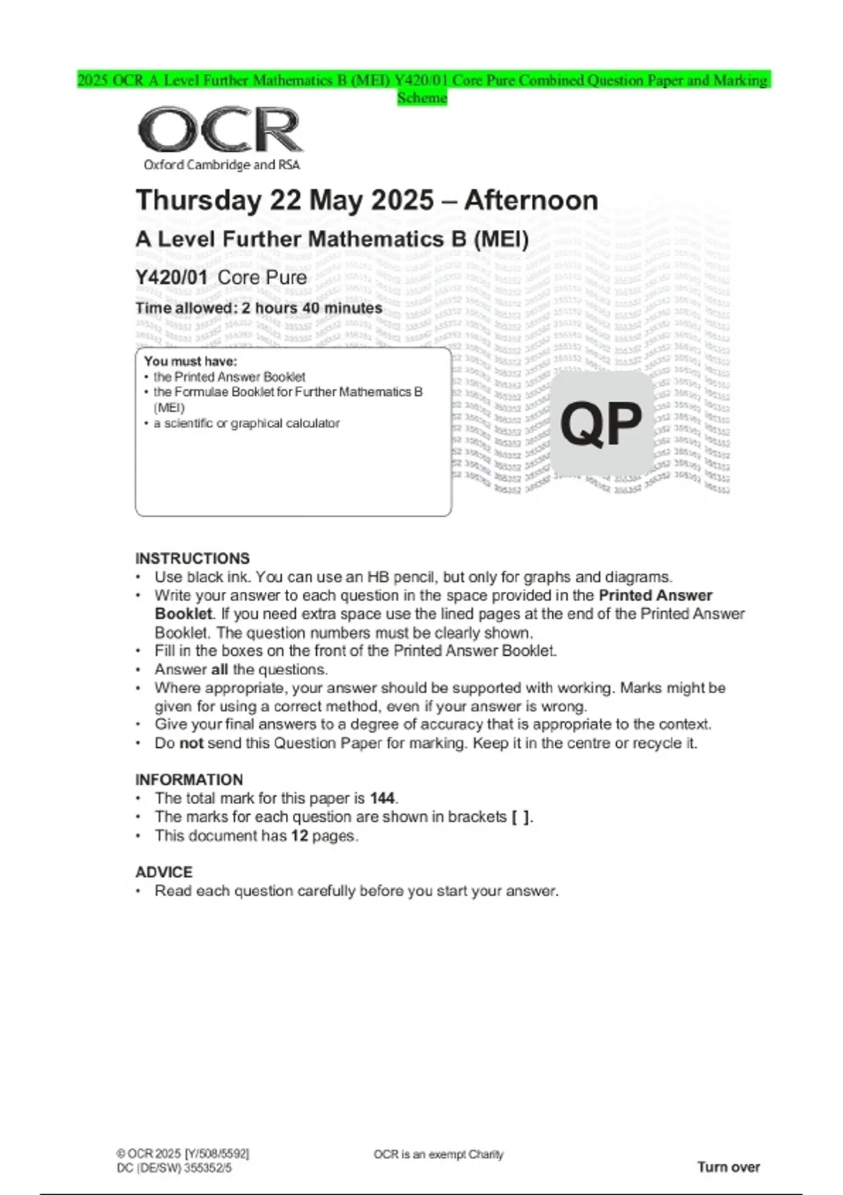 2025 OCR A Level Further Mathematics B (MEI) Y420/01 Core Pure Combined Question Paper and Marking Scheme