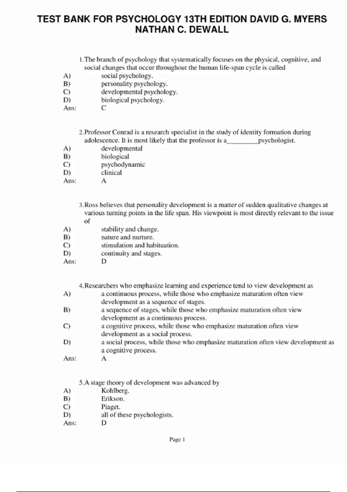 TEST BANK FOR PSYCHOLOGY 13TH EDITION DAVID G. MYERS NATHAN C. DEWALL