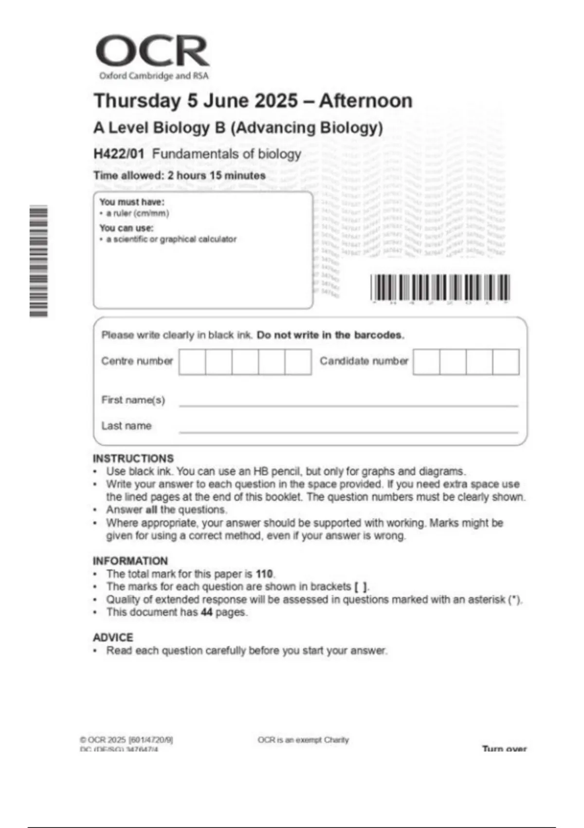 OCR 2025 A Level Biology B (Advancing Biology)Paper 1| H422-01| June 2025| Question paper and Mark scheme| MERGED