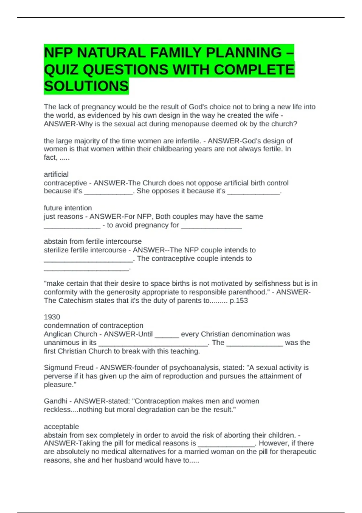 NFP NATURAL FAMILY PLANNING – QUIZ QUESTIONS WITH COMPLETE SOLUTIONS