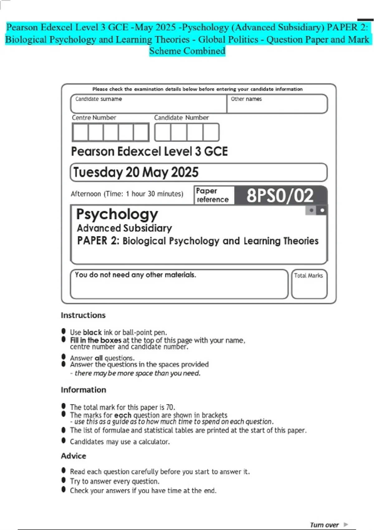 Pearson Edexcel Level 3 GCE -May 2025 -Pyschology (Advanced Subsidiary) PAPER 2: Biological Psychology and Learning Theories - Global Politics - Question Paper and Mark Scheme Combined