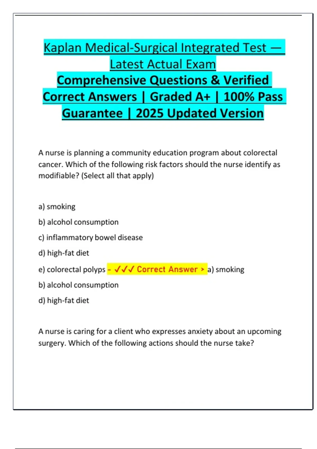 Comprehensive Kaplan Medical-Surgical Integrated Test with verified, instructor-level answers — updated for 2025. Over 300 practice questions replicate Kaplan’s integrated style and cover cardiovascular, respiratory, endocrine, GI, renal, and multisystem patient care. Each item includes the correct answer and concise rationale to accelerate learning and boost clinical reasoning. Perfect for nursing students preparing for clinical exams, course finals, or NCLEX-style med-surg mastery.