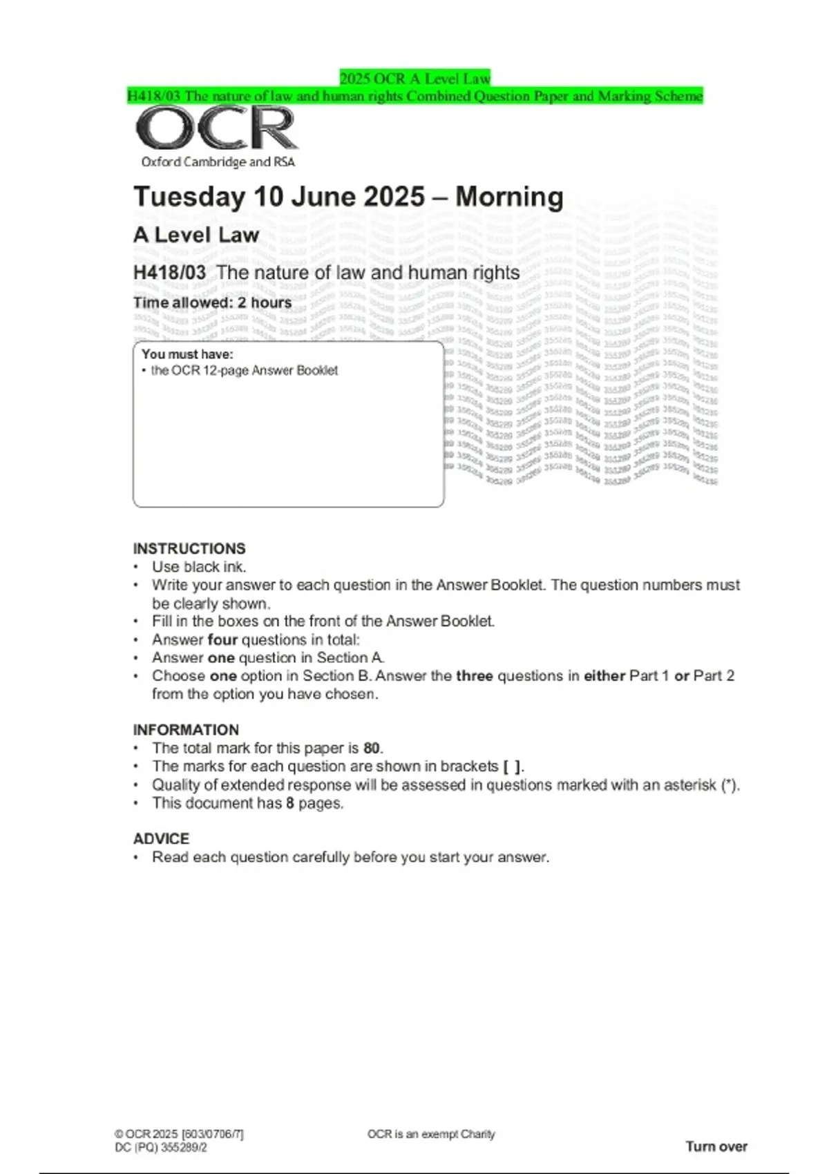 2025 OCR A Level Law H418/03 The nature of law and human rights Combined Question Paper and Marking Scheme