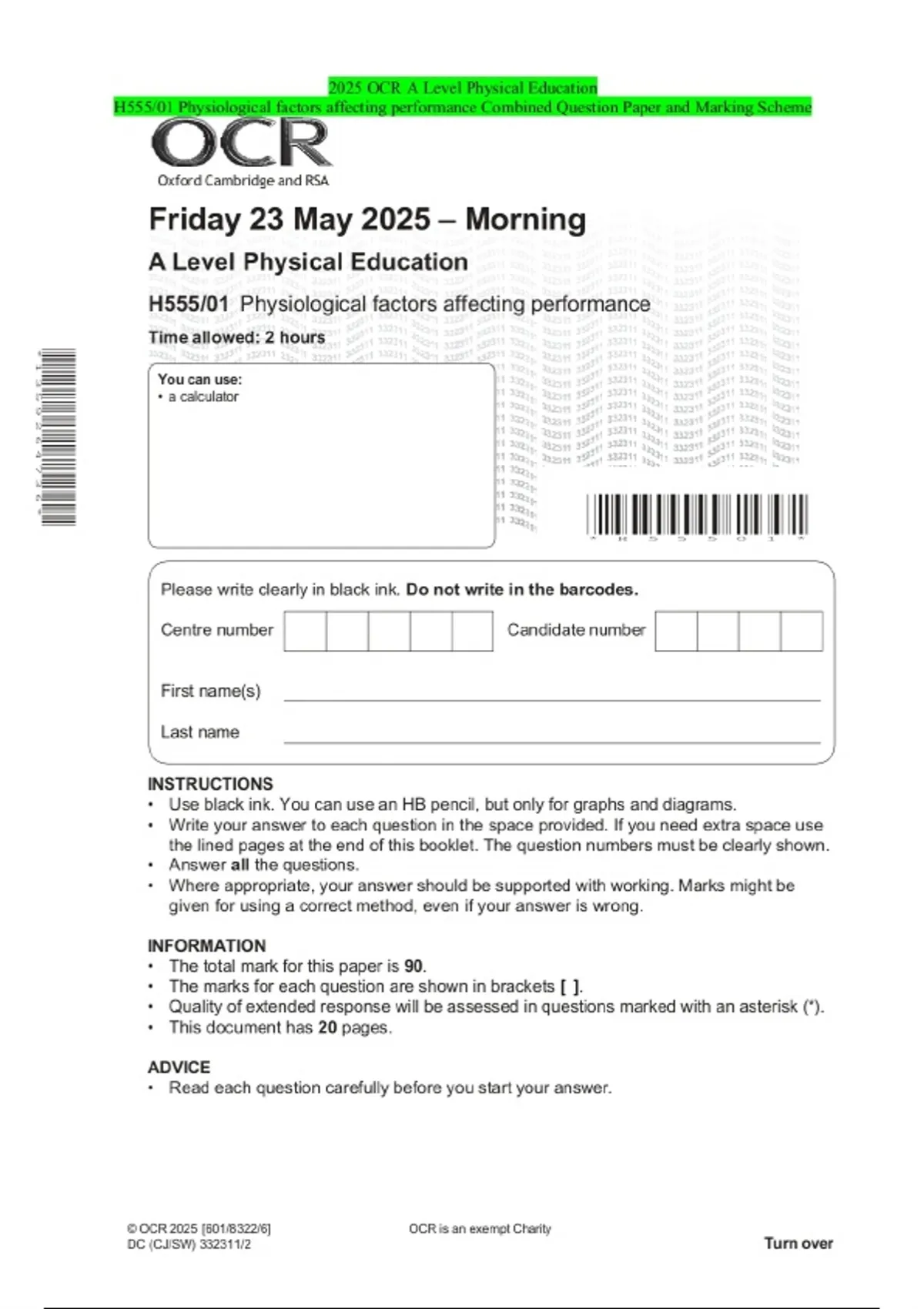 2025 OCR A Level Physical Education H555/01 Physiological factors affecting performance Combined Question Paper and Marking Scheme