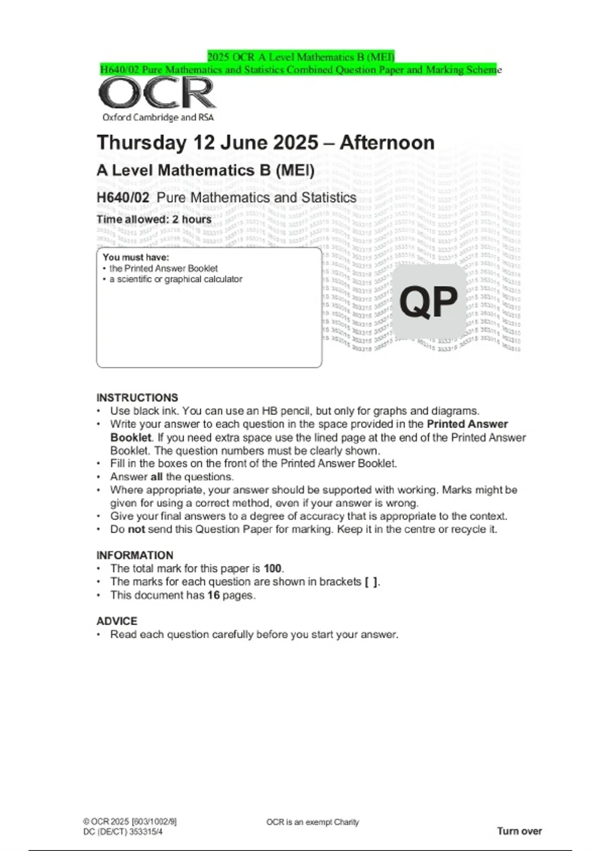 2025 OCR A Level Mathematics B (MEI) H640/02 Pure Mathematics and Statistics Combined Question Paper and Marking Scheme