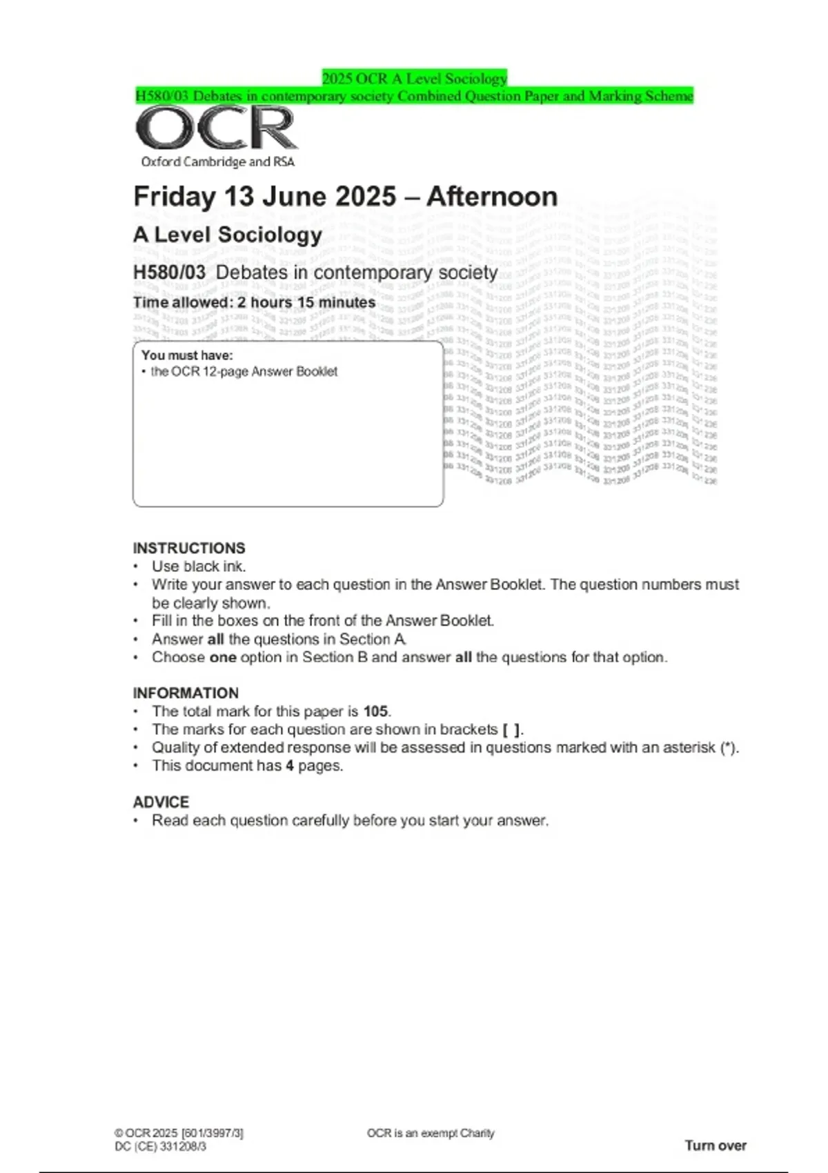 2025 OCR A Level Sociology H580/03 Debates in contemporary society Combined Question Paper and Marking Scheme