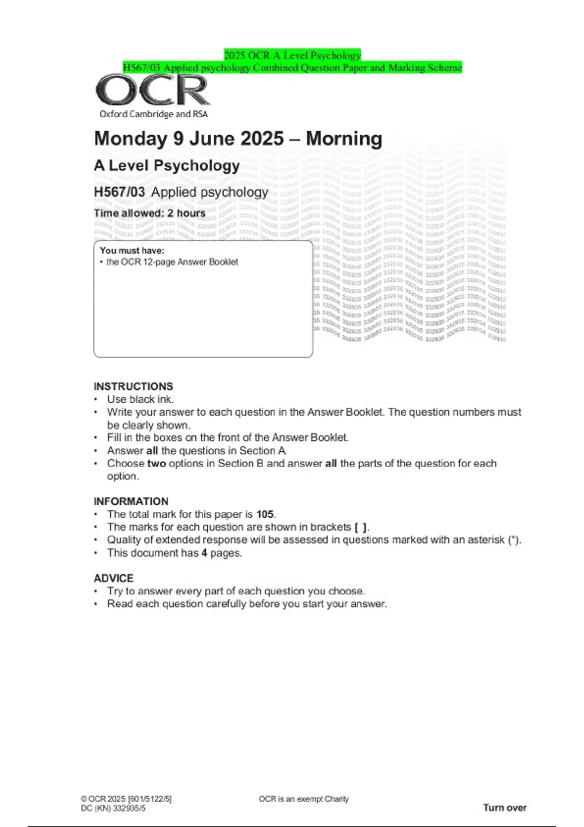 2025 OCR A Level Psychology H567/03 Applied psychology Combined Question Paper and Marking Scheme