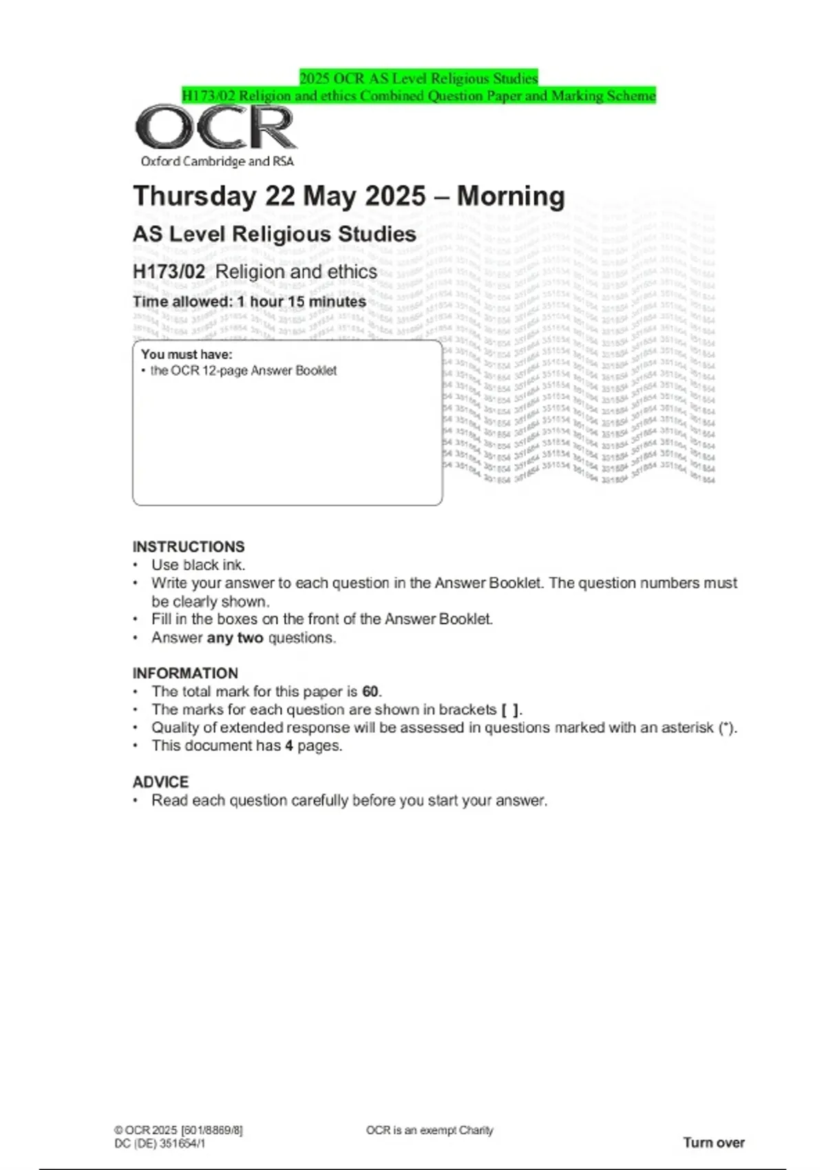 2025 OCR AS Level Religious Studies H173/02 Religion and ethics Combined Question Paper and Marking Scheme