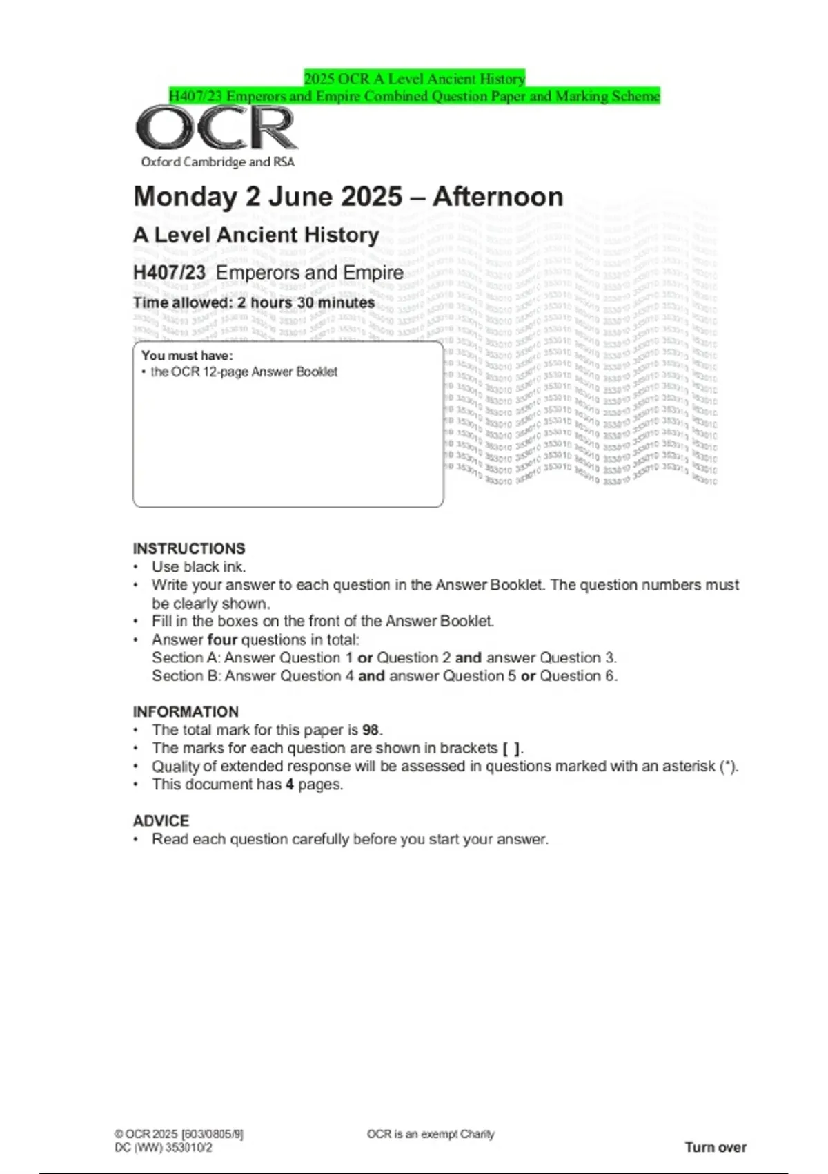2025 OCR A Level Ancient History H407/23 Emperors and Empire Combined Question Paper and Marking Scheme