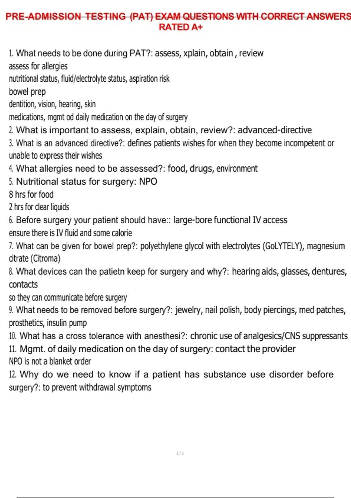 PRE-ADMISSION TESTING (PAT) EXAM QUESTIONS WITH CORRECT ANSWERS