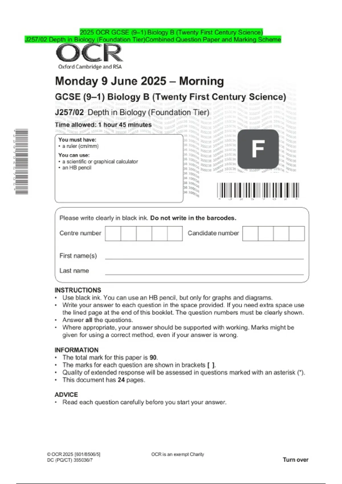 PACKAGE DEAL-::2025 OCR GCSE (9–1) Biology B (Twenty First Century Science Exam|Combined Question Paper and Marking Scheme