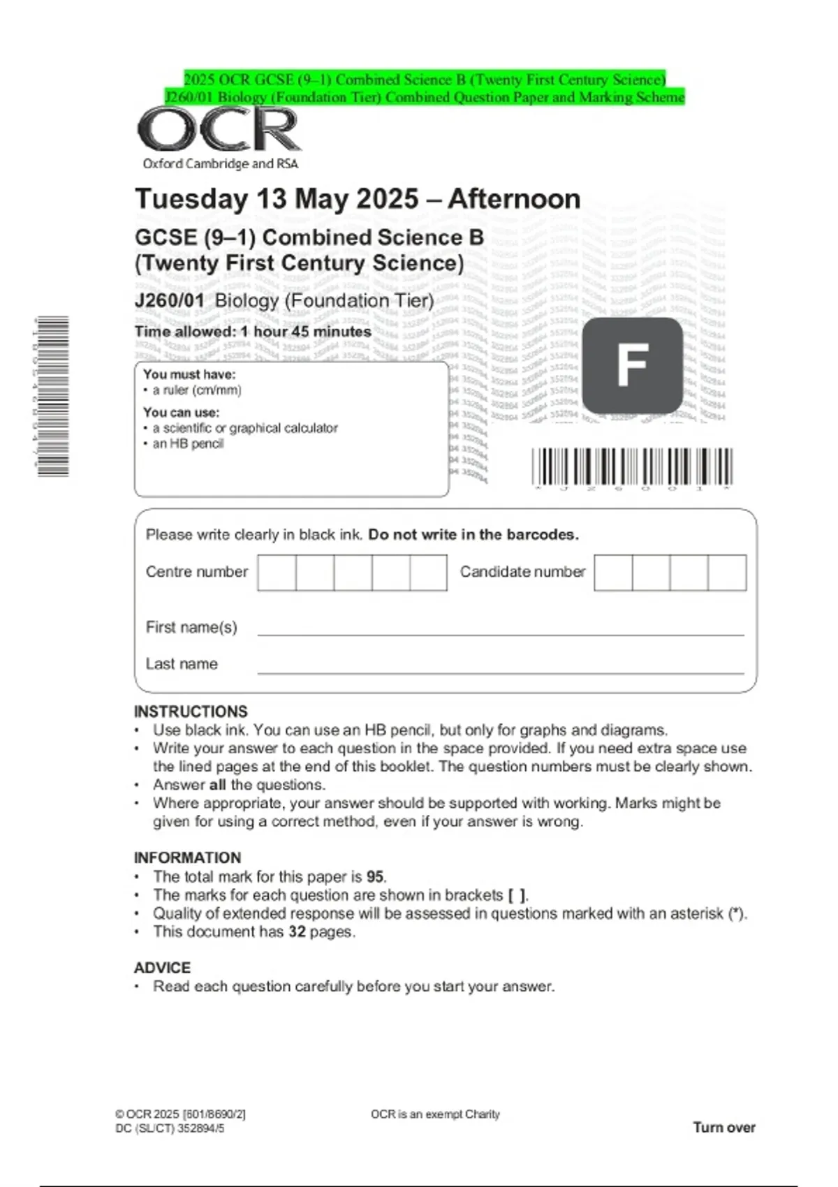 2025 OCR GCSE (9–1) Combined Science B (Twenty First Century Science) J260/01 Biology (Foundation Tier) Combined Question Paper and Marking Scheme