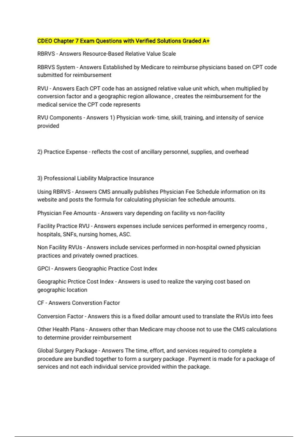CDEO Chapter 7 Exam Questions with Verified Solutions Graded A+ RBRVS - Answers Resource-Based Relative Value Scale RBRVS System - Answers Established by Medicare to reimburse physicians based on CPT code submitted for reimbursement RVU - Answers Each CPT code has an assigned relative value unit which, when multiplied by conversion factor and a geographic region allowance , creates the reimbursement for the medical service the CPT code represents RVU Components - Answers 1) Physician work- time, skill, training, and intensity of service provided 2) Practice Expense - reflects the cost of ancillary personnel, supplies, and overhead 3) Professional Liability Malpractice Insurance Using RBRVS - Answers CMS annually publishes Physician Fee Schedule information on its website and posts the formula for calculating physician fee schedule amounts. Physician Fee Amounts - Answers vary depending on facility vs non-facility Facility Practice RVU - Answers expenses include services performed in emergency rooms , hospitals, SNFs, nursing homes, ASC. Non Facility RVUs - Answers include services performed in non-hospital owned physician practices and privately owned practices. GPCI - Answers Geographic Practice Cost Index Geographic Prctice Cost Index - Answers is used to realize the varying cost based on geographic location CF - Answers Converstion Factor Conversion Factor - Answers this is a fixed dollar amount used to translate the RVUs into fees Other Health Plans - Answers other than Medicare may choose not to use the CMS calculations to determine provider reimbursement Global Surgery Package - Answers The time, effort, and services required to complete a procedure are bundled together to form a surgery package . Payment is made for a package of services and not each individual service provided within the package.