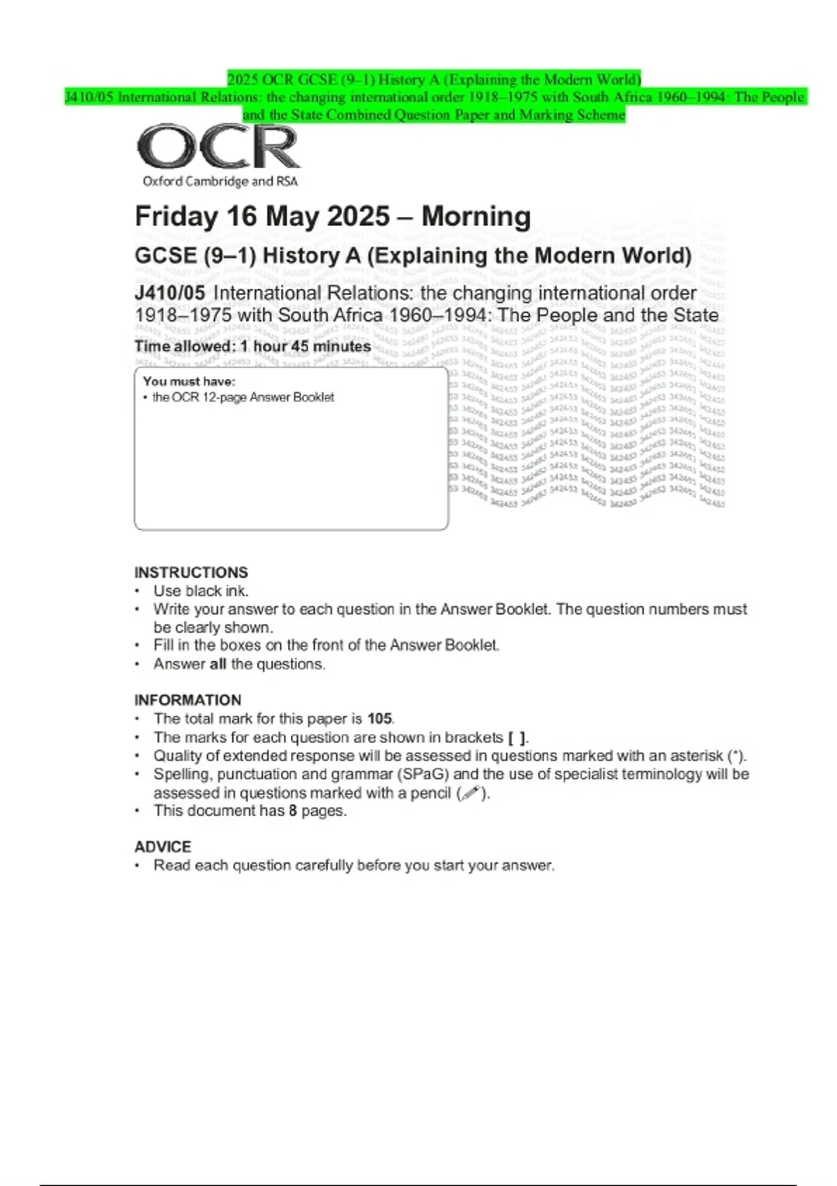 PACKAGE DEAL-::2025 OCR GCSE (9–1) History A (Explaining the Modern World)Exams|Combined Question Paper and Final Marking Scheme