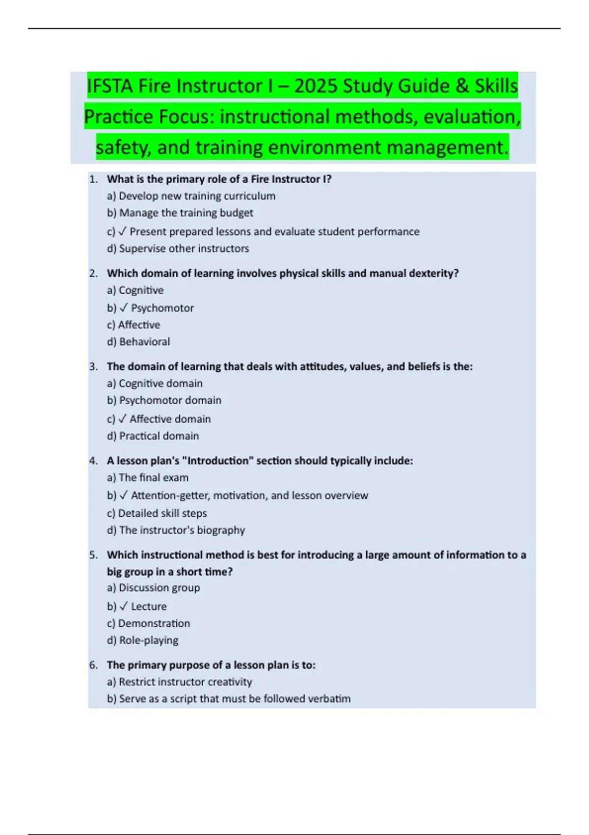 IFSTA Fire Instructor I – 2025 Study Guide & Skills Practice Focus: instructional methods, evaluation, safety, and training environment management.