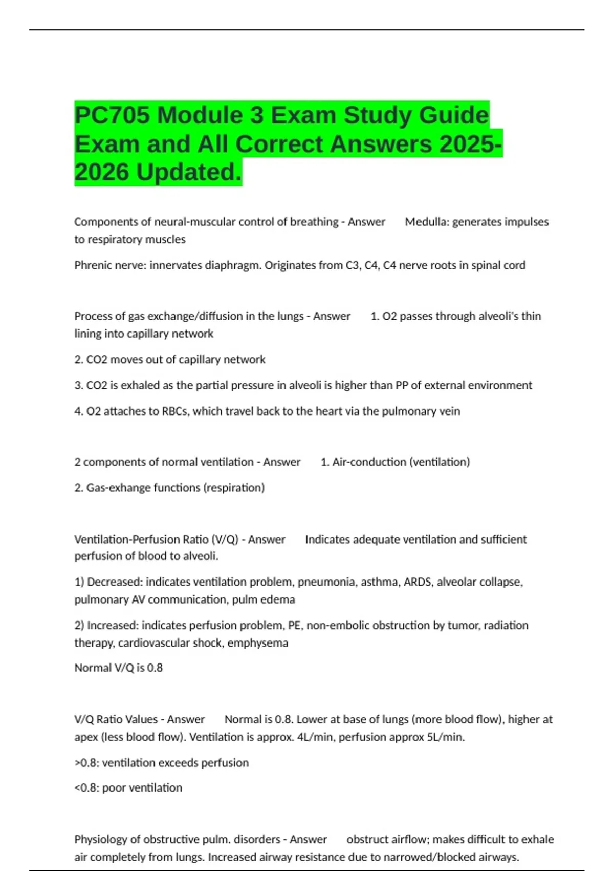 Components of neural-muscular control of breathing - Answer Medulla: generates impulses to respiratory muscles Phrenic nerve: innervates diaphragm. Originates from C3, C4, C4 nerve roots in spinal cord Process of gas exchange/diffusion in the lungs - Answer 1. O2 passes through alveoli's thin lining into capillary network 2. CO2 moves out of capillary network 3. CO2 is exhaled as the partial pressure in alveoli is higher than PP of external environment 4. O2 attaches to RBCs, which travel back to the heart via the pulmonary vein 2 components of normal ventilation - Answer 1. Air-conduction (ventilation) 2. Gas-exhange functions (respiration) Ventilation-Perfusion Ratio (V/Q) - Answer Indicates adequate ventilation and sufficient perfusion of blood to alveoli. 1) Decreased: indicates ventilation problem, pneumonia, asthma, ARDS, alveolar collapse, pulmonary AV communication, pulm edema 2) Increased: indicates perfusion problem, PE, non-embolic obstruction by tumor, radiation therapy, cardiovascular shock, emphysema Normal V/Q is 0.8 V/Q Ratio Values - Answer Normal is 0.8. Lower at base of lungs (more blood flow), higher at apex (less blood flow). Ventilation is approx. 4L/min, perfusion approx 5L/min. >0.8: ventilation exceeds perfusion <0.8: poor ventilation