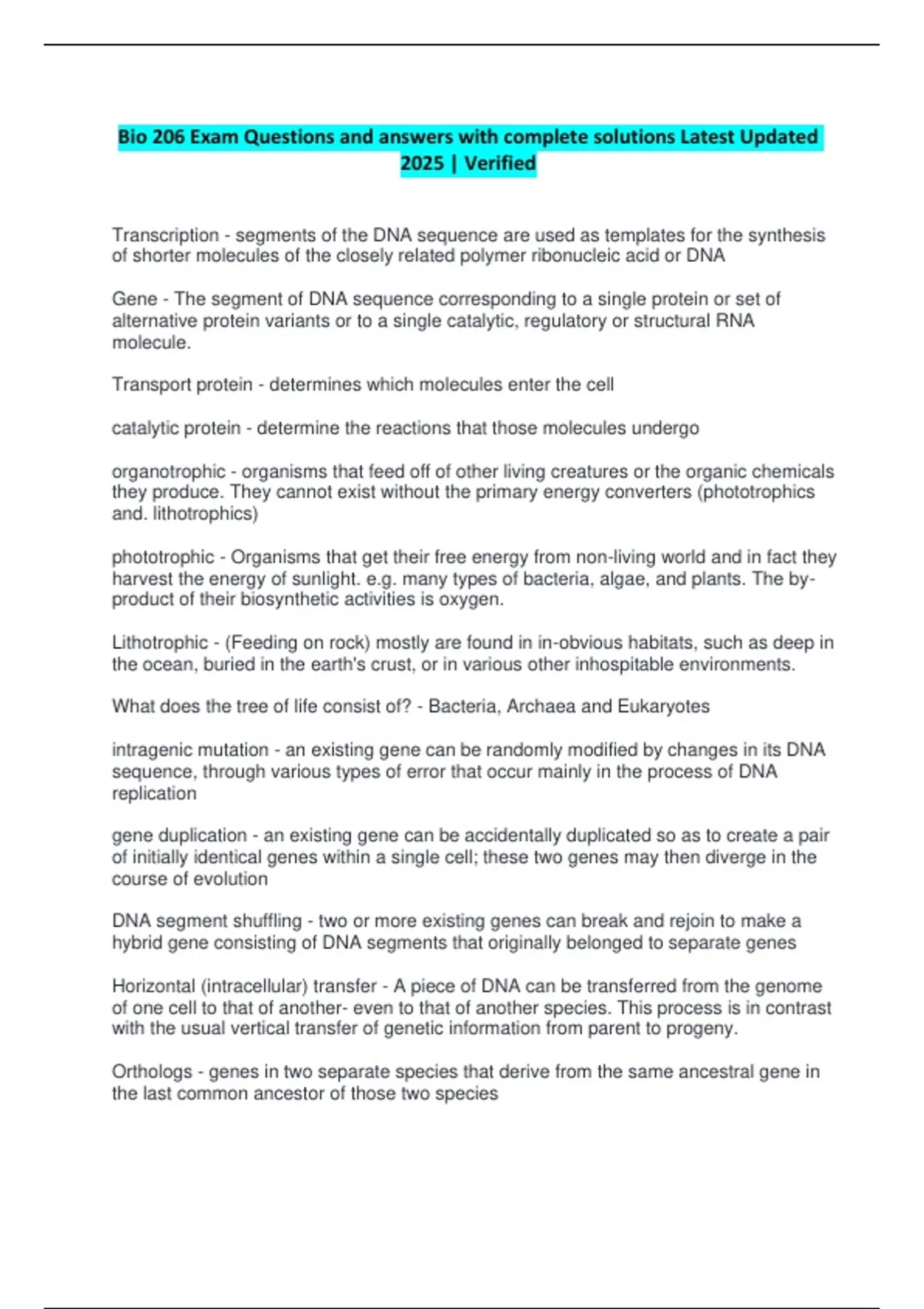 Bio 206 Exam Questions and answers with complete solutions Latest Updated 2025 | Verified. Exam Questions and Correct Answers With 100% Correct Answers | Latest 2025 Update.
