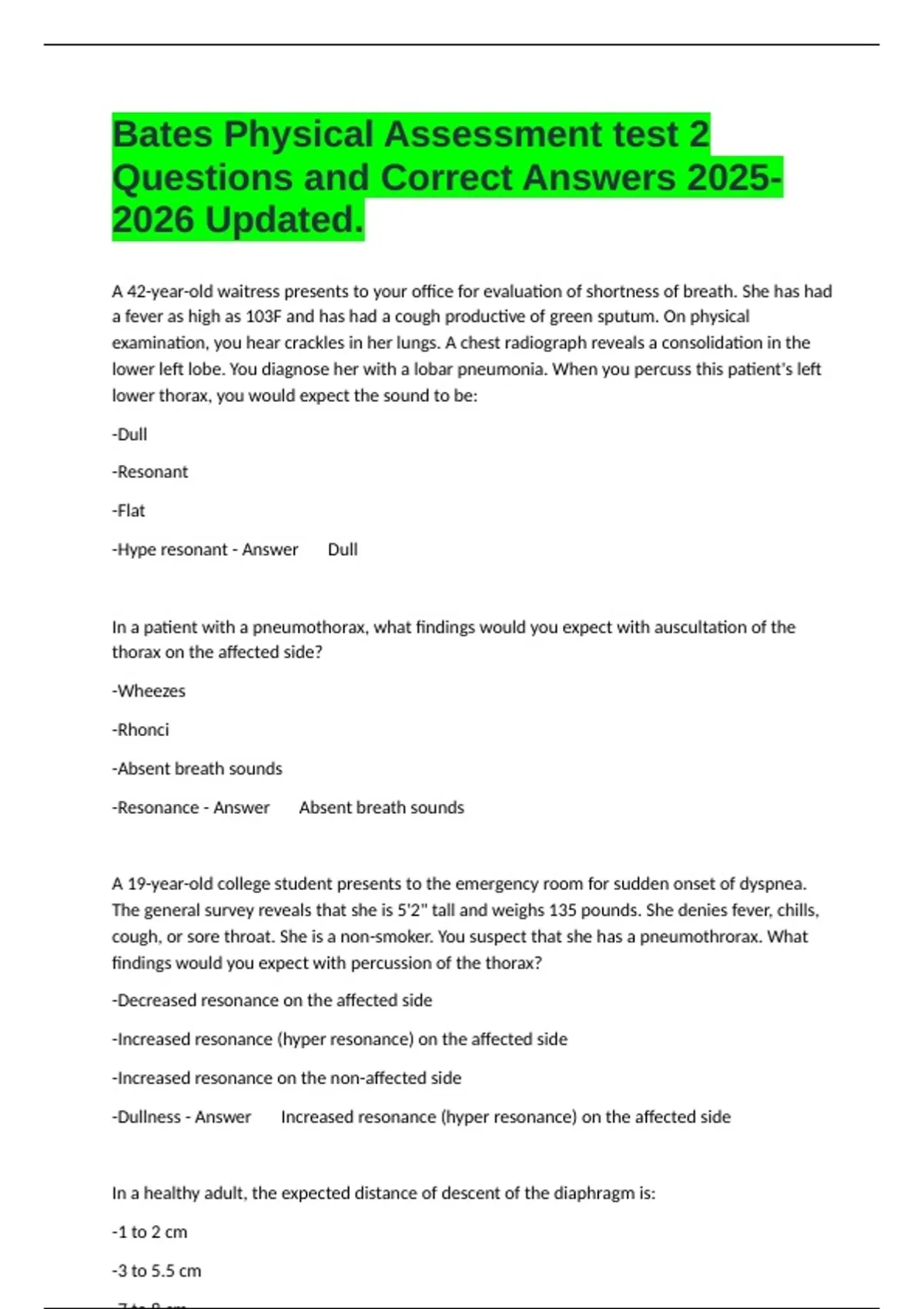-Dullness - Answer Increased resonance (hyper resonance) on the affected side