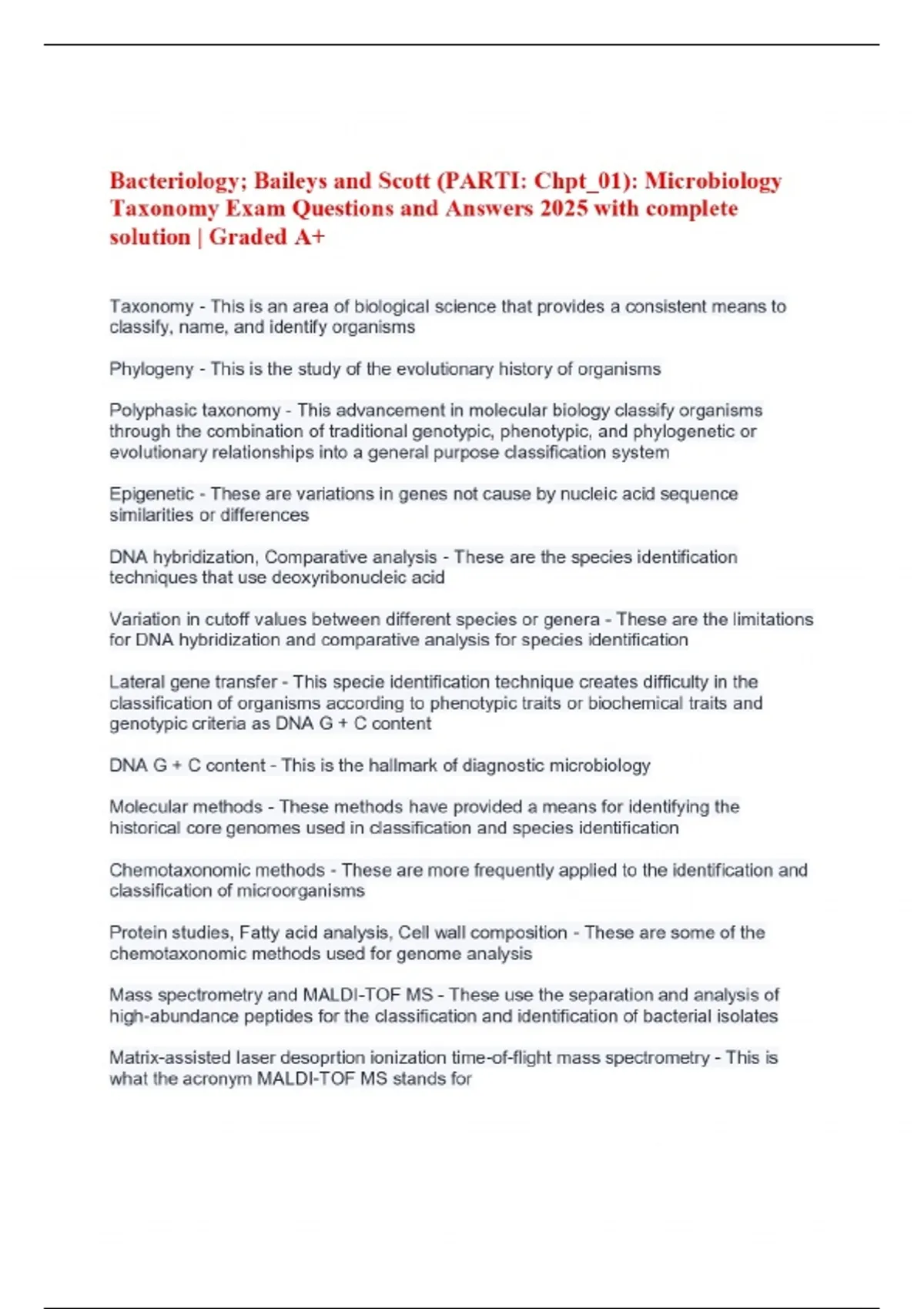 Bacteriology; Baileys and Scott (PARTI: Chpt_01): Microbiology Taxonomy Exam Questions and Answers 2025 with complete solution | Graded A+
