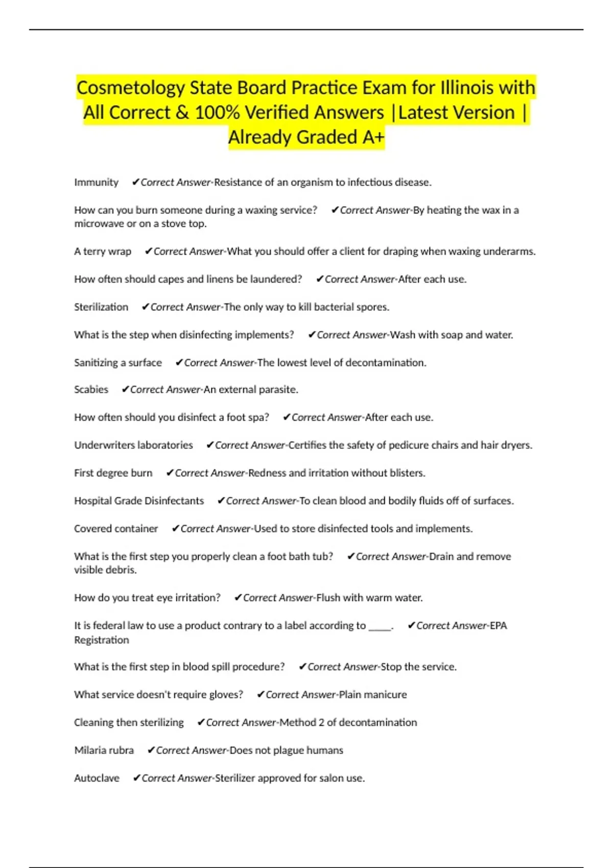 Hospital Grade Disinfectants ✔Correct Answer-To clean blood and bodily fluids off of surfaces.