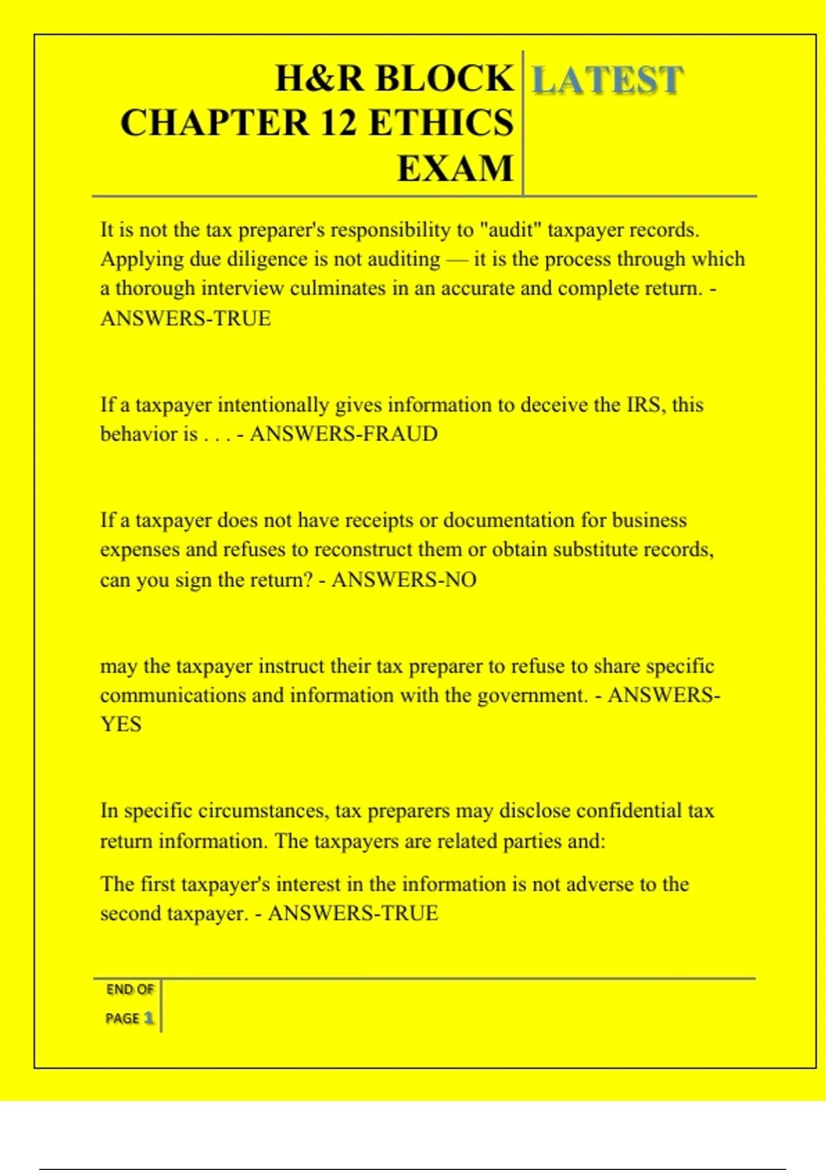 H&R BLOCK CHAPTER 12 ETHICS EXAM QUESTIONS AND ANSWERS 2026