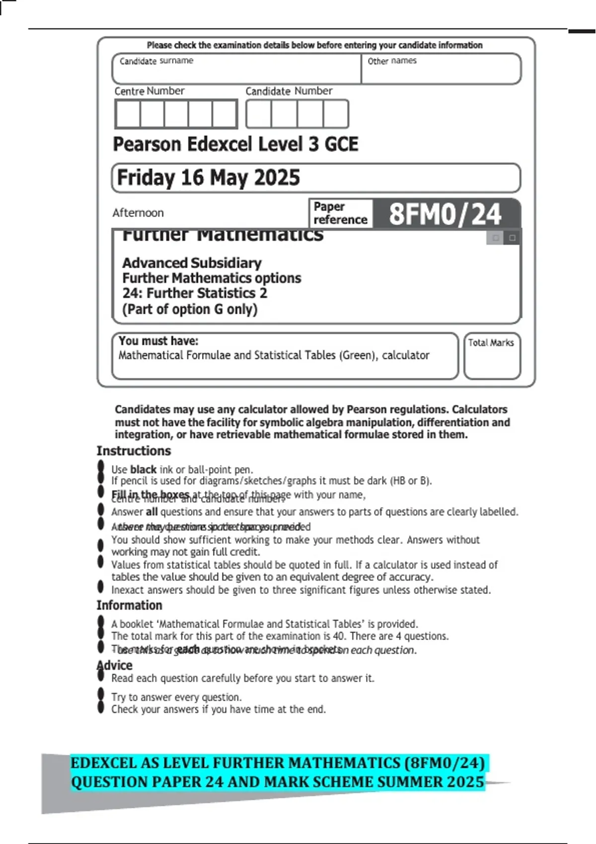 EDEXCEL AS LEVEL FURTHER MATHEMATICS (8FM0/24) QUESTION PAPER 24 AND MARK SCHEME SUMMER 2025